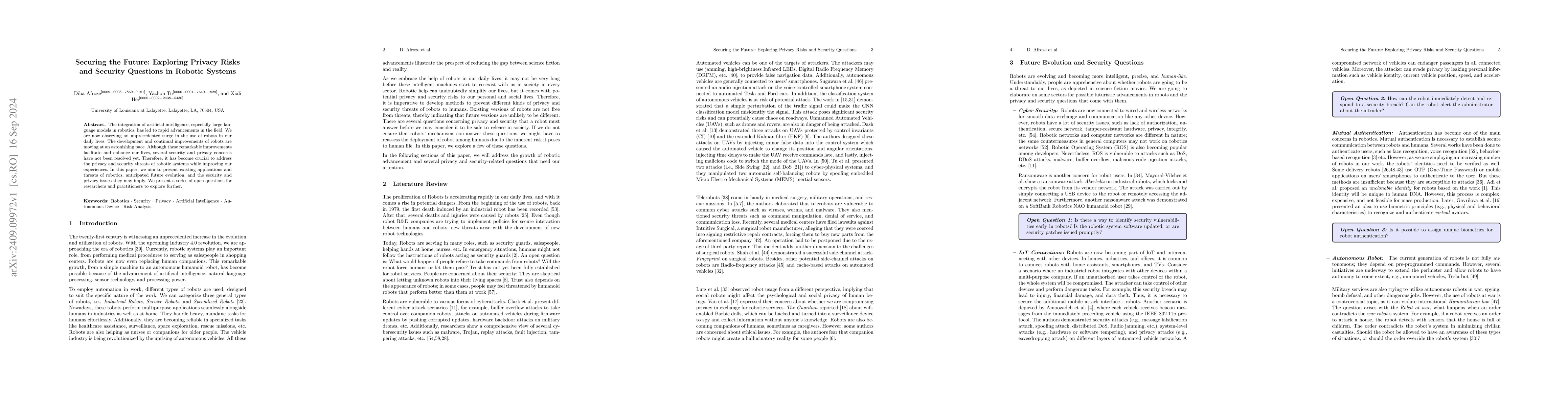 This paper investigates the rapid advancements in robotics fueled by artificial intelligence, emphasizing both the benefits and the unresolved security and privacy risks. It outlines current applications, future prospects, and associated threats, proposing open questions for further research and practical solutions.
