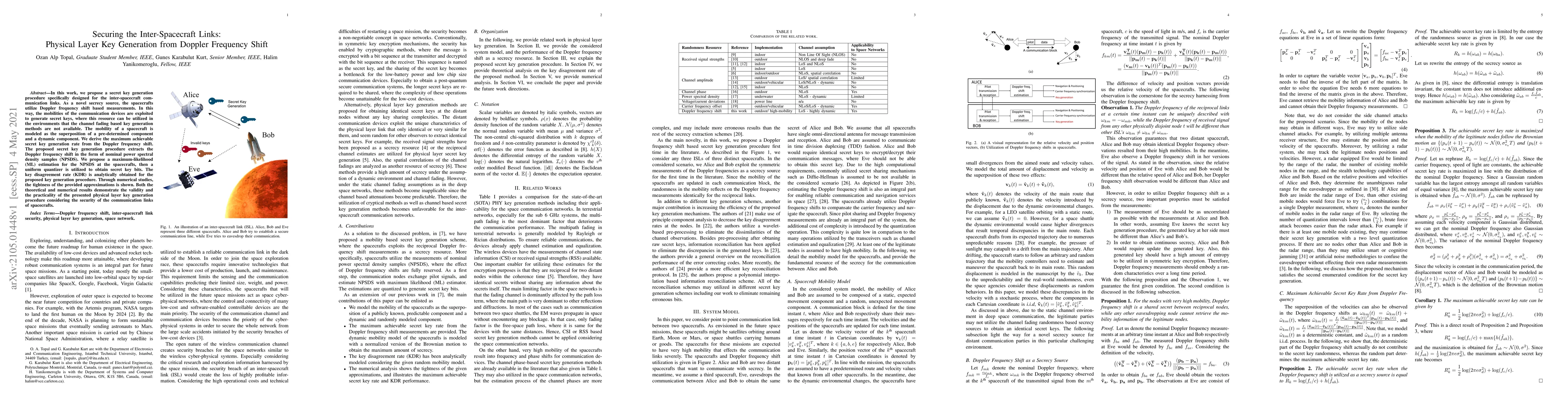 In this work, we propose a secret key generation procedure specifically designed for the inter-spacecraft communication links. As a novel secrecy source, the spacecrafts utilize Doppler frequency shift based measurements. In this way, the mobilities of the communication devices are exploited to generate secret keys, where this resource can be utilized in the environments that the channel fading based key generation methods are not available. The mobility of a spacecraft is modeled as the superposition of a pre-determined component and a dynamic component. We derive the maximum achievable secret key generation rate from the Doppler frequency shift. The proposed secret key generation procedure extracts the Doppler frequency shift in the form of nominal power spectral density samples (NPSDS). We propose a maximum-likelihood (ML) estimation for the NPSDS at the spacecrafts, then a uniform quantizer is utilized to obtain secret key bits. The key disagreement rate (KDR) is analytically obtained for the proposed key generation procedure. Through numerical studies, the tightness of the provided approximations is shown. Both the theoretical and numerical results demonstrate the validity and the practicality of the presented physical layer key generation procedure considering the security of the communication links of spacecrafts.
