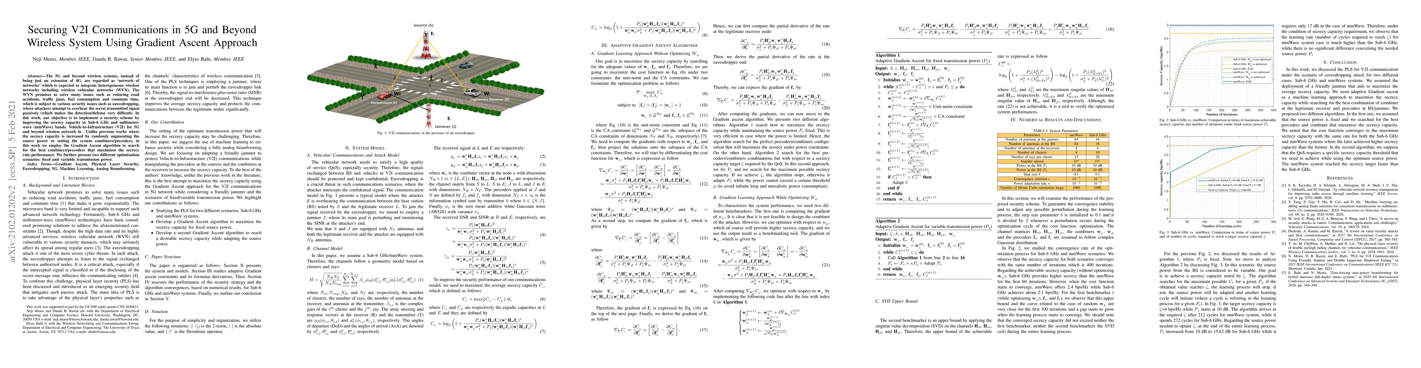The 5G and beyond wireless systems, instead of being just an extension of 4G, are regarded as `network of networks' which is expected to integrate heterogeneous wireless networks including wireless vehicular networks (WVN). The WVN promises to solve many issues such as reducing road accidents, traffic jams, fuel consumption and commute time, which is subject to various security issues such as eavesdropping, where attackers attempt to overhear the secret transmitted signal passively (which makes the detection/defense very difficult). In this work, our objective is to implement a security scheme by improving the secrecy capacity in Sub-6 GHz and millimeter-wave (mmWave) bands. Vehicle-to-Infrastructure (V2I) for 5G and beyond wireless network. Unlike previous works where the secrecy capacity is increased by randomly augmenting the source power or setting the system combiners/precoders, in this work we employ the Gradient Ascent algorithm to search for the best combiners/precoders that maximize the secrecy rate performance. We further present two different optimization scenarios: fixed and variable transmission power.