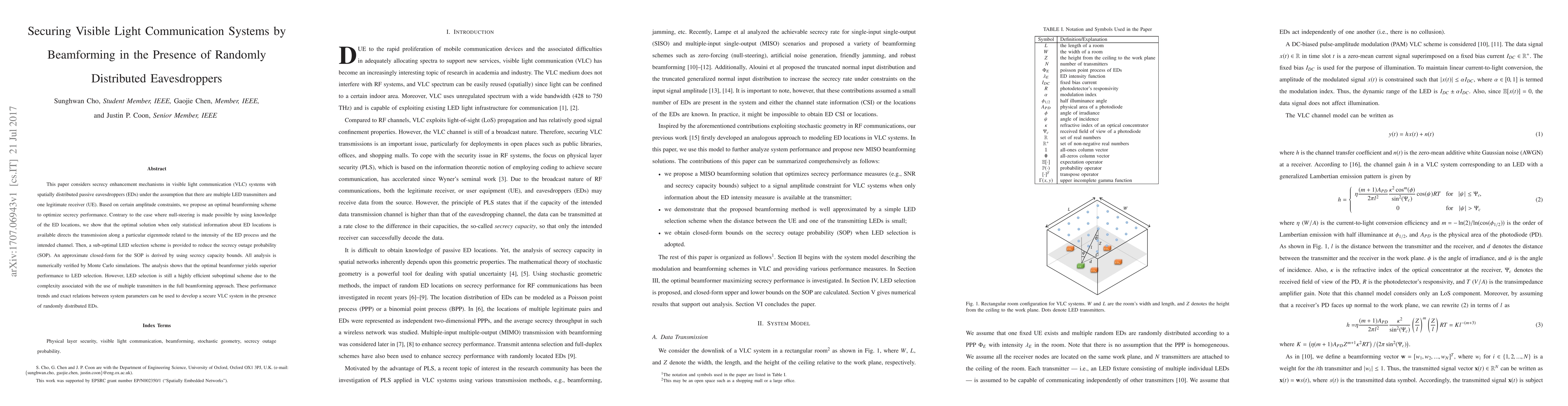 Researchers propose an optimal beamforming scheme to secure visible light communication systems against randomly distributed eavesdroppers, outperforming a suboptimal LED selection method in terms of secrecy performance.