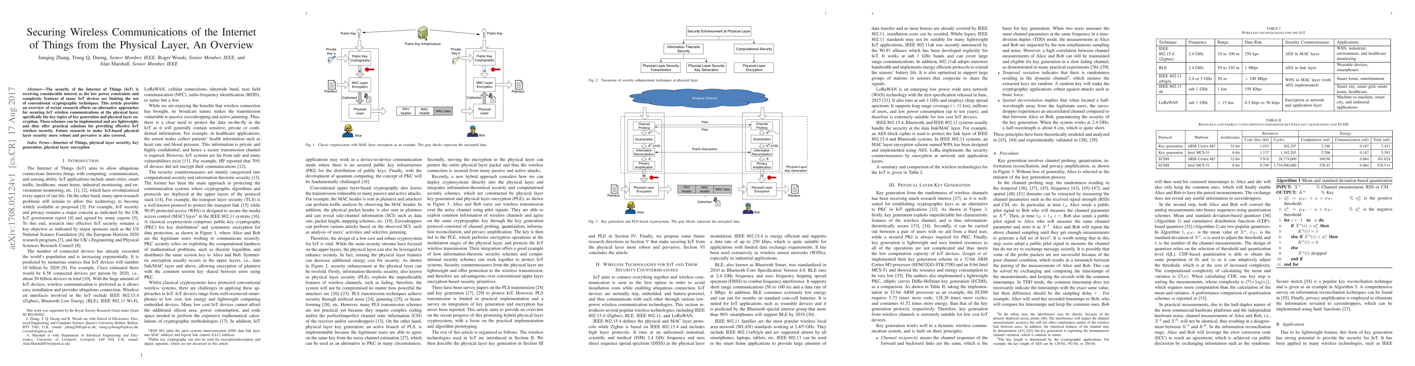 The security of the Internet of Things (IoT) is receiving considerable interest as the low power constraints and complexity features of many IoT devices are limiting the use of conventional cryptographic techniques. This article provides an overview of recent research efforts on alternative approaches for securing IoT wireless communications at the physical layer, specifically the key topics of key generation and physical layer encryption. These schemes can be implemented and are lightweight, and thus offer practical solutions for providing effective IoT wireless security. Future research to make IoT-based physical layer security more robust and pervasive is also covered.