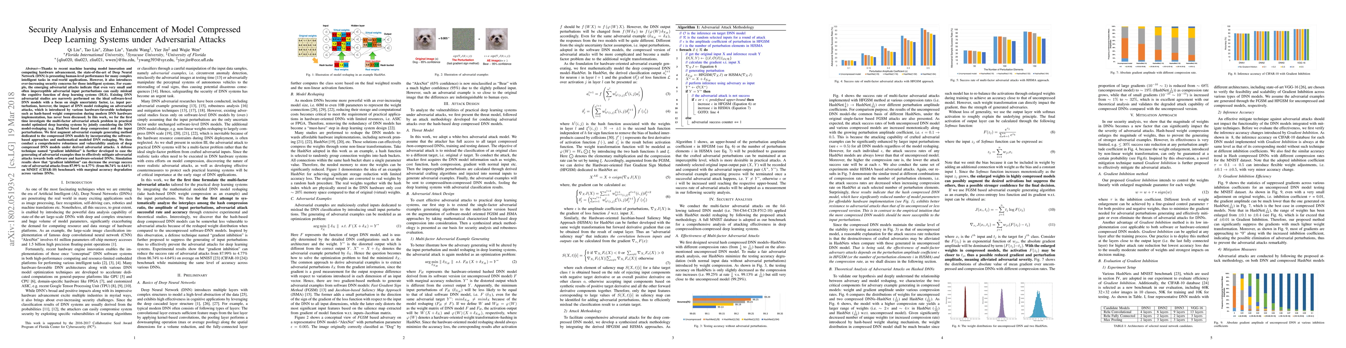 DNN is presenting human-level performance for many complex intelligent tasks in real-world applications. However, it also introduces ever-increasing security concerns. For example, the emerging adversarial attacks indicate that even very small and often imperceptible adversarial input perturbations can easily mislead the cognitive function of deep learning systems (DLS). Existing DNN adversarial studies are narrowly performed on the ideal software-level DNN models with a focus on single uncertainty factor, i.e. input perturbations, however, the impact of DNN model reshaping on adversarial attacks, which is introduced by various hardware-favorable techniques such as hash-based weight compression during modern DNN hardware implementation, has never been discussed. In this work, we for the first time investigate the multi-factor adversarial attack problem in practical model optimized deep learning systems by jointly considering the DNN model-reshaping (e.g. HashNet based deep compression) and the input perturbations. We first augment adversarial example generating method dedicated to the compressed DNN models by incorporating the software-based approaches and mathematical modeled DNN reshaping. We then conduct a comprehensive robustness and vulnerability analysis of deep compressed DNN models under derived adversarial attacks. A defense technique named "gradient inhibition" is further developed to ease the generating of adversarial examples thus to effectively mitigate adversarial attacks towards both software and hardware-oriented DNNs. Simulation results show that "gradient inhibition" can decrease the average success rate of adversarial attacks from 87.99% to 4.77% (from 86.74% to 4.64%) on MNIST (CIFAR-10) benchmark with marginal accuracy degradation across various DNNs.