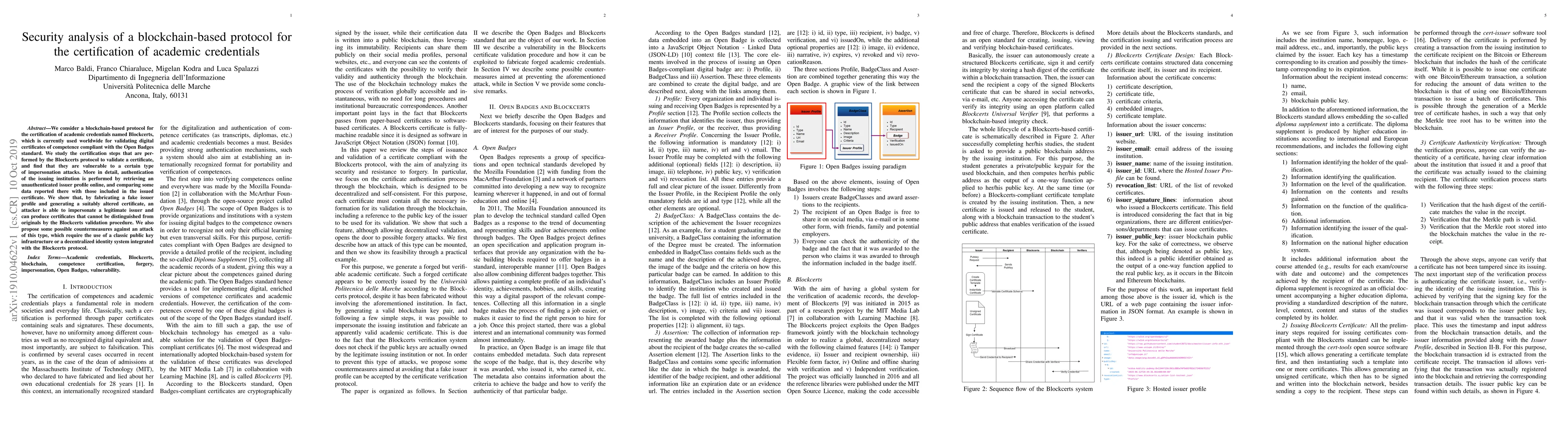 This paper analyzes the Blockcerts blockchain-based protocol for academic credential certification, identifying vulnerabilities to impersonation attacks due to unauthenticated issuer profiles. Proposed countermeasures involve integrating traditional public key infrastructure or decentralized identity systems.