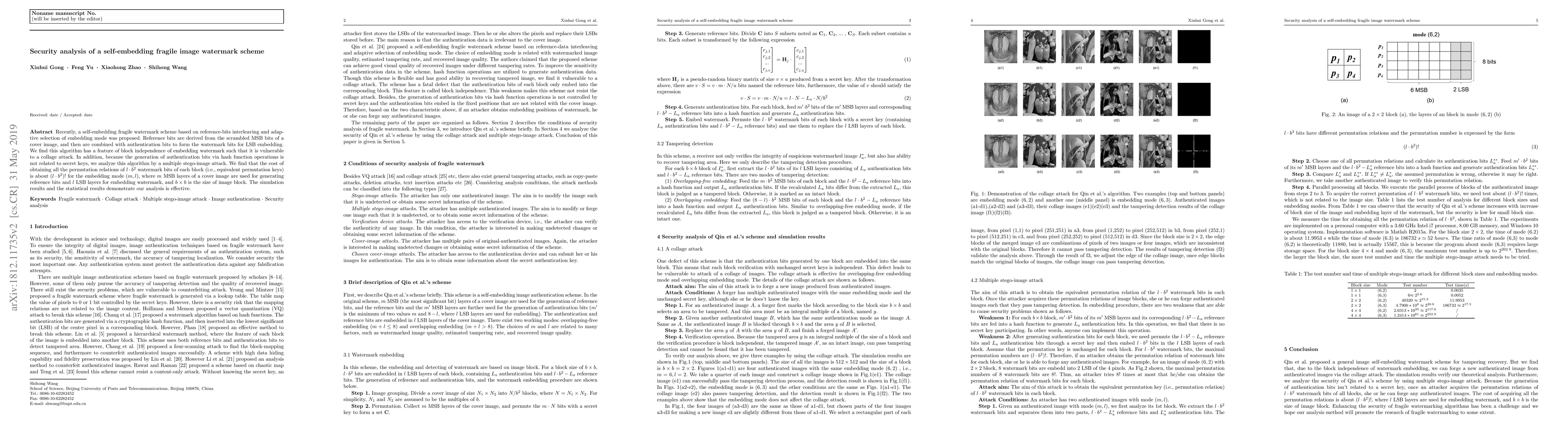 This paper analyzes the security of a self-embedding fragile watermark scheme that uses reference bits and adaptive embedding modes, finding it vulnerable to collage attacks and multiple stego-image attacks due to its block independence and lack of secret key dependency in authentication bit generation. The analysis reveals the high computational cost of obtaining all permutation relations of watermark bits.
