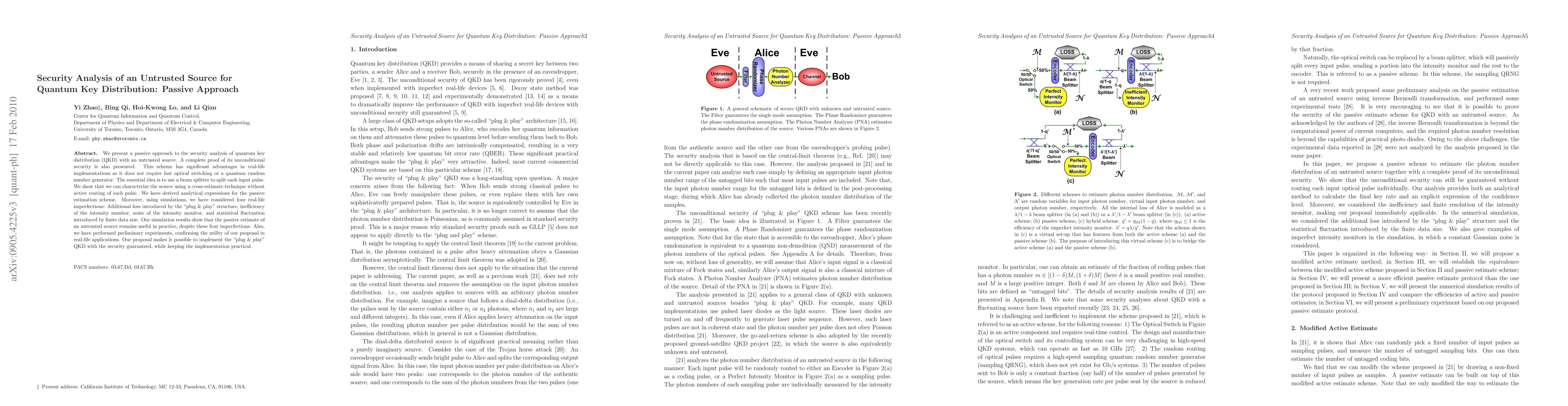 We present a passive approach to the security analysis of quantum key distribution (QKD) with an untrusted source. A complete proof of its unconditional security is also presented. This scheme has significant advantages in real-life implementations as it does not require fast optical switching or a quantum random number generator. The essential idea is to use a beam splitter to split each input pulse. We show that we can characterize the source using a cross-estimate technique without active routing of each pulse. We have derived analytical expressions for the passive estimation scheme. Moreover, using simulations, we have considered four real-life imperfections: Additional loss introduced by the "plug & play" structure, inefficiency of the intensity monitor, noise of the intensity monitor, and statistical fluctuation introduced by finite data size. Our simulation results show that the passive estimate of an untrusted source remains useful in practice, despite these four imperfections. Also, we have performed preliminary experiments, confirming the utility of our proposal in real-life applications. Our proposal makes it possible to implement the "plug & play" QKD with the security guaranteed, while keeping the implementation practical.