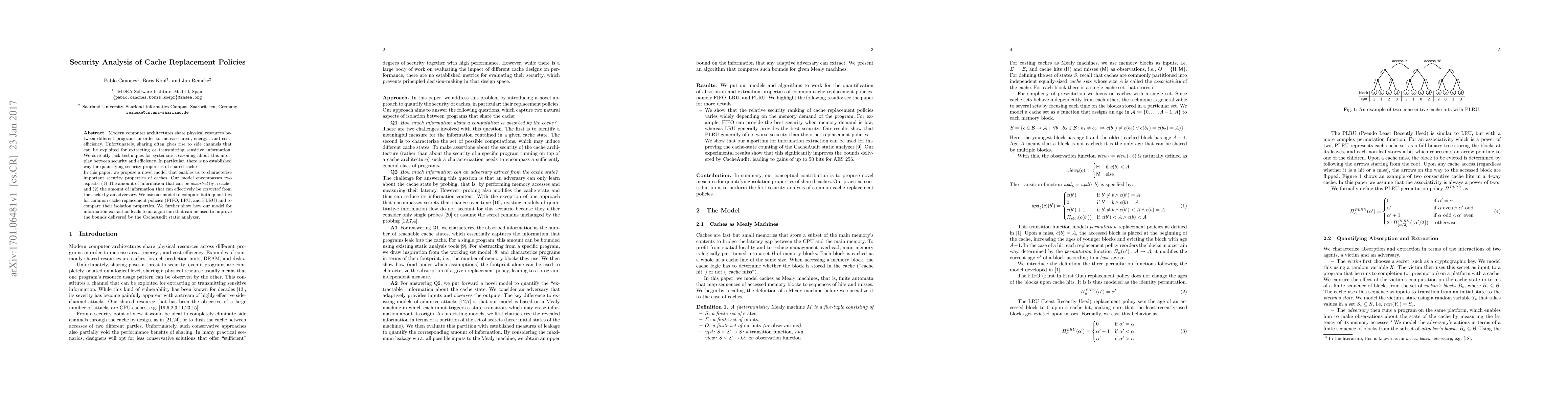 This paper introduces a novel model to quantify security properties of shared caches, focusing on the information absorption and extraction capabilities. It evaluates common cache replacement policies (FIFO, LRU, and PLRU) using this model to compare their security isolation properties and enhances the CacheAudit static analyzer with a new information extraction algorithm.