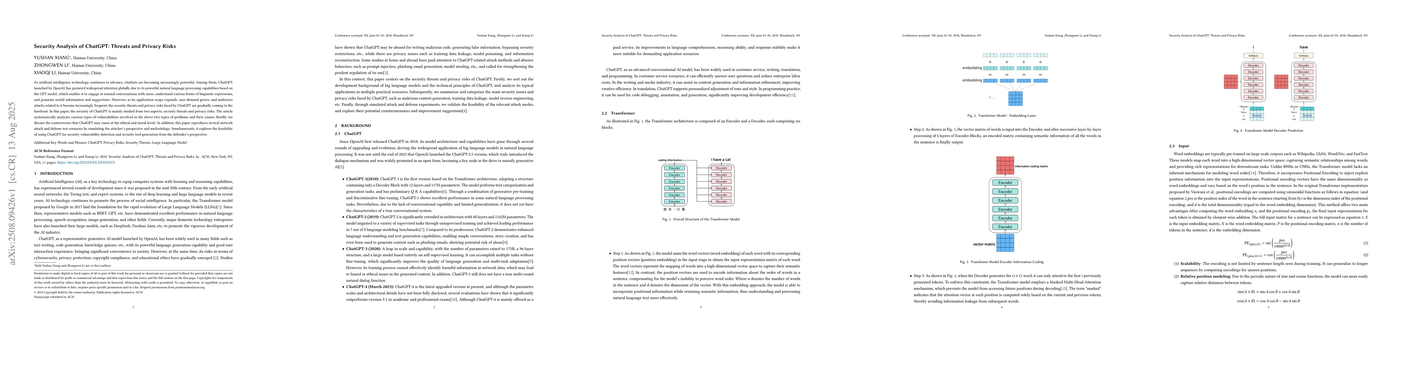As artificial intelligence technology continues to advance, chatbots are becoming increasingly powerful. Among them, ChatGPT, launched by OpenAI, has garnered widespread attention globally due to its powerful natural language processing capabilities based on the GPT model, which enables it to engage in natural conversations with users, understand various forms of linguistic expressions, and generate useful information and suggestions. However, as its application scope expands, user demand grows, and malicious attacks related to it become increasingly frequent, the security threats and privacy risks faced by ChatGPT are gradually coming to the forefront. In this paper, the security of ChatGPT is mainly studied from two aspects, security threats and privacy risks. The article systematically analyzes various types of vulnerabilities involved in the above two types of problems and their causes. Briefly, we discuss the controversies that ChatGPT may cause at the ethical and moral levels. In addition, this paper reproduces several network attack and defense test scenarios by simulating the attacker's perspective and methodology. Simultaneously, it explores the feasibility of using ChatGPT for security vulnerability detection and security tool generation from the defender's perspective.