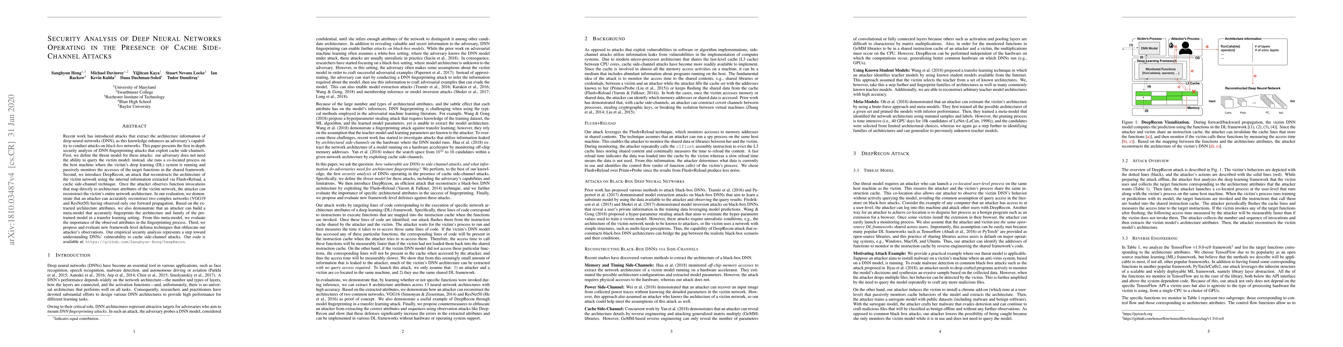 This paper conducts an in-depth security analysis of cache side-channel attacks that can extract the architecture of deep neural networks (DNNs) without querying the model. It introduces DeepRecon, an attack that reconstructs DNN architectures using Flush+Reload techniques, and proposes new defense mechanisms to obfuscate such attacks.