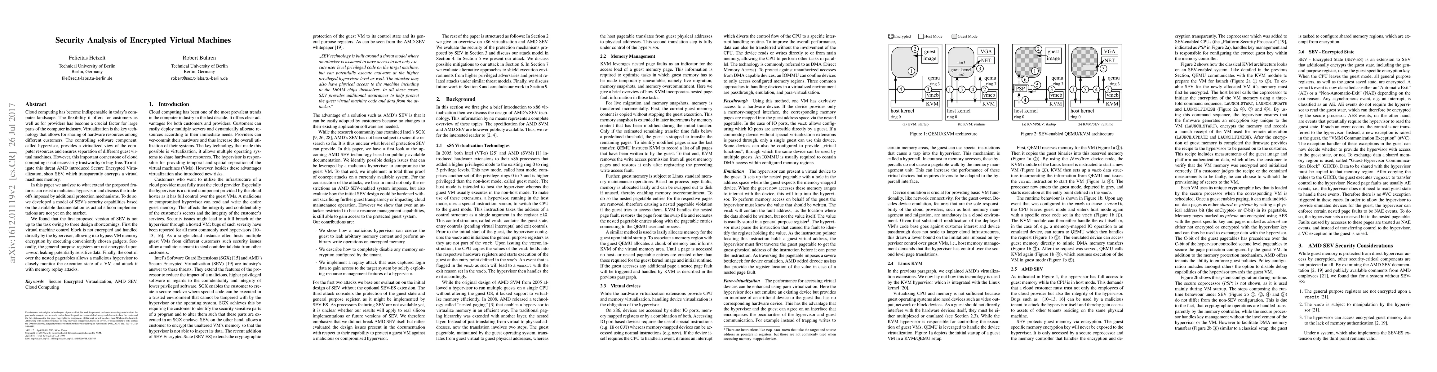This paper analyzes the security of AMD's Secure Encrypted Virtualization (SEV) for protecting encrypted virtual machines against malicious hypervisors. Despite SEV's aim to encrypt guest memory, the paper identifies three design flaws: unencrypted VM control blocks, unencrypted general purpose registers, and control of nested page tables, which collectively undermine SEV's effectiveness.