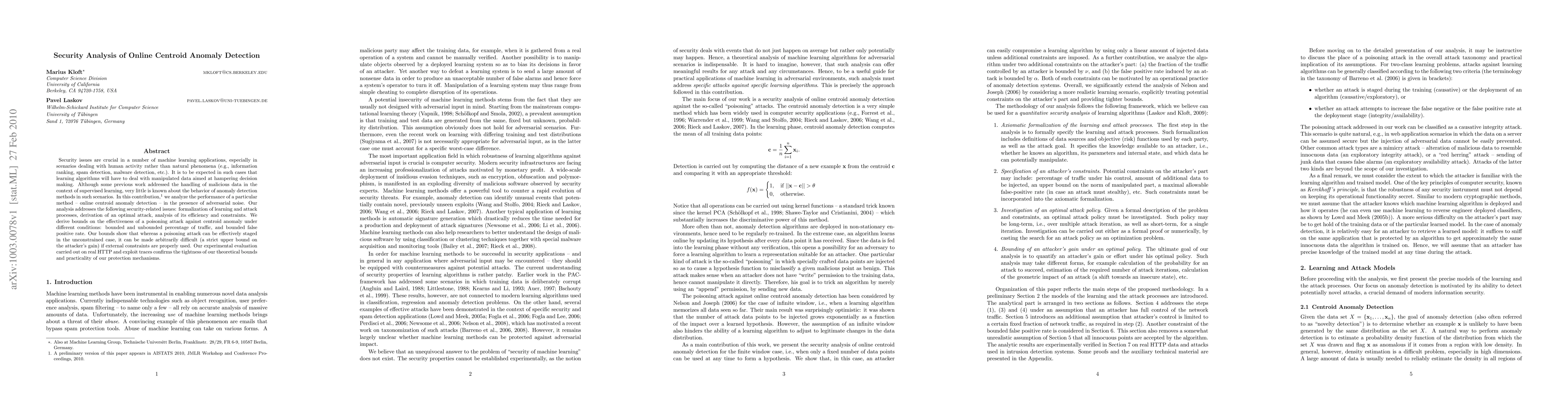 This research paper analyzes the security of an online centroid anomaly detection method in the presence of adversarial noise, finding that external constraints can make poisoning attacks difficult to stage.
