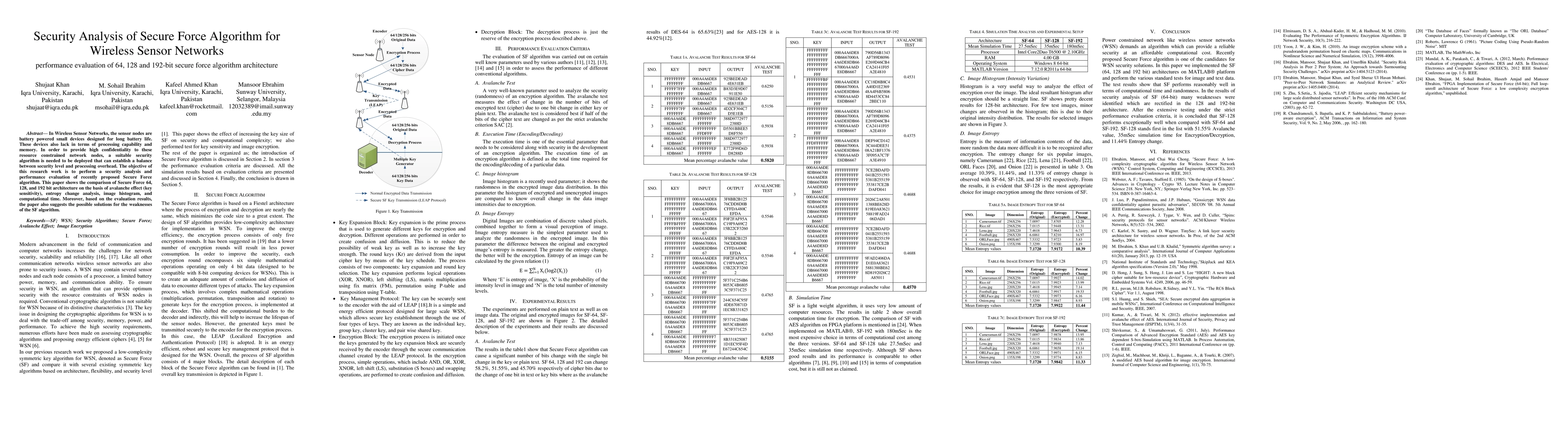 In Wireless Sensor Networks, the sensor nodes are battery powered small devices designed for long battery life. These devices also lack in terms of processing capability and memory. In order to provide high confidentiality to these resource constrained network nodes, a suitable security algorithm is needed to be deployed that can establish a balance between security level and processing overhead. The objective of this research work is to perform a security analysis and performance evaluation of recently proposed Secure Force algorithm. This paper shows the comparison of Secure Force 64, 128, and 192 bit architecture on the basis of avalanche effect (key sensitivity), entropy change analysis, image histogram, and computational time. Moreover, based on the evaluation results, the paper also suggests the possible solutions for the weaknesses of the SF algorithm.