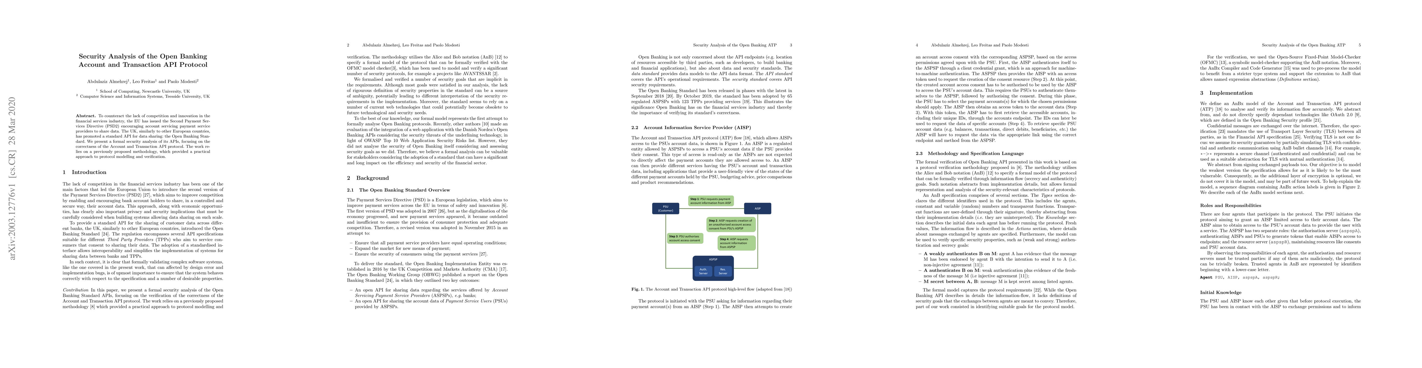 This paper conducts a formal security analysis of the Open Banking Account and Transaction API protocol, aiming to ensure the correctness and security of data sharing in the financial services industry as mandated by the EU's Second Payment Services Directive (PSD2). The analysis employs a previously established methodology for protocol modelling and verification.