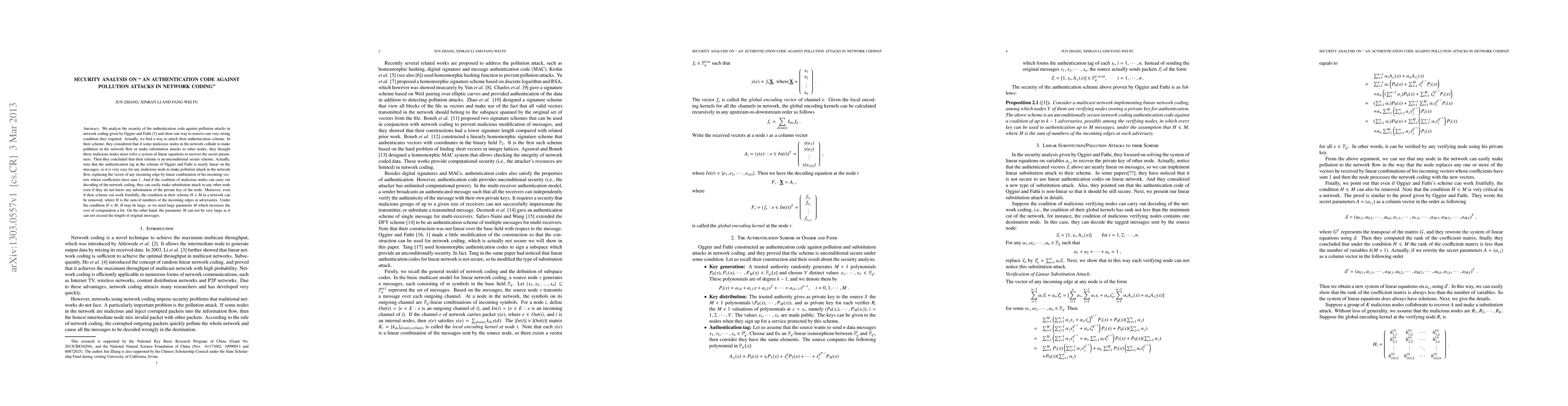 This paper critiques the security of an authentication code against pollution attacks in network coding by Oggier and Fathi. It demonstrates that their scheme is vulnerable to pollution attacks and substitution attacks, and proposes removing a restrictive condition they imposed, thereby reducing computational costs.