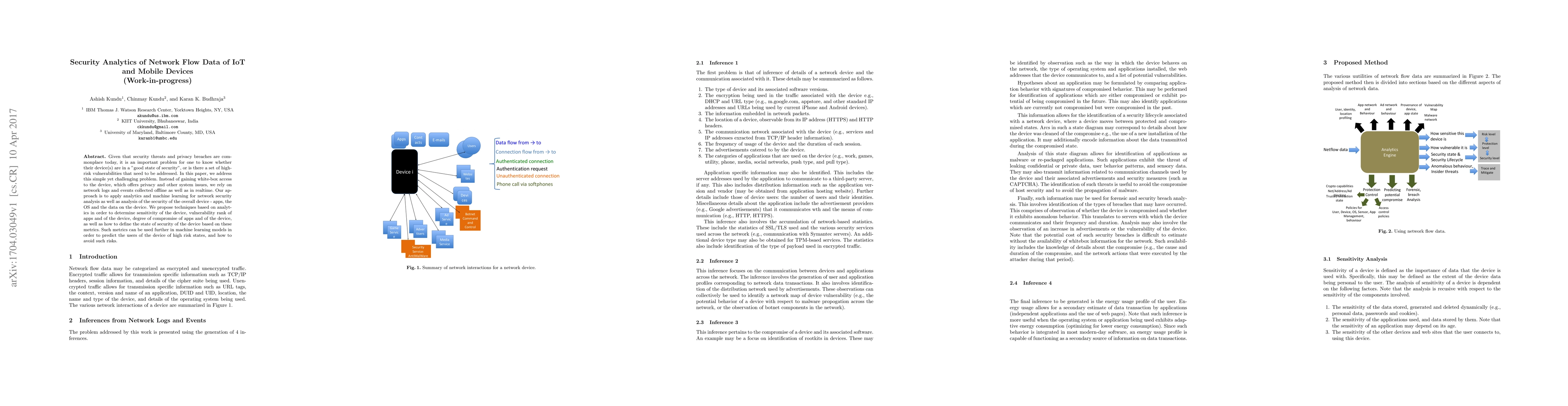 Given that security threats and privacy breaches are com- monplace today, it is an important problem for one to know whether their device(s) are in a "good state of security", or is there a set of high- risk vulnerabilities that need to be addressed. In this paper, we address this simple yet challenging problem. Instead of gaining white-box access to the device, which offers privacy and other system issues, we rely on network logs and events collected offine as well as in realtime. Our approach is to apply analytics and machine learning for network security analysis as well as analysis of the security of the overall device - apps, the OS and the data on the device. We propose techniques based on analytics in order to determine sensitivity of the device, vulnerability rank of apps and of the device, degree of compromise of apps and of the device, as well as how to define the state of security of the device based on these metrics. Such metrics can be used further in machine learning models in order to predict the users of the device of high risk states, and how to avoid such risks.
