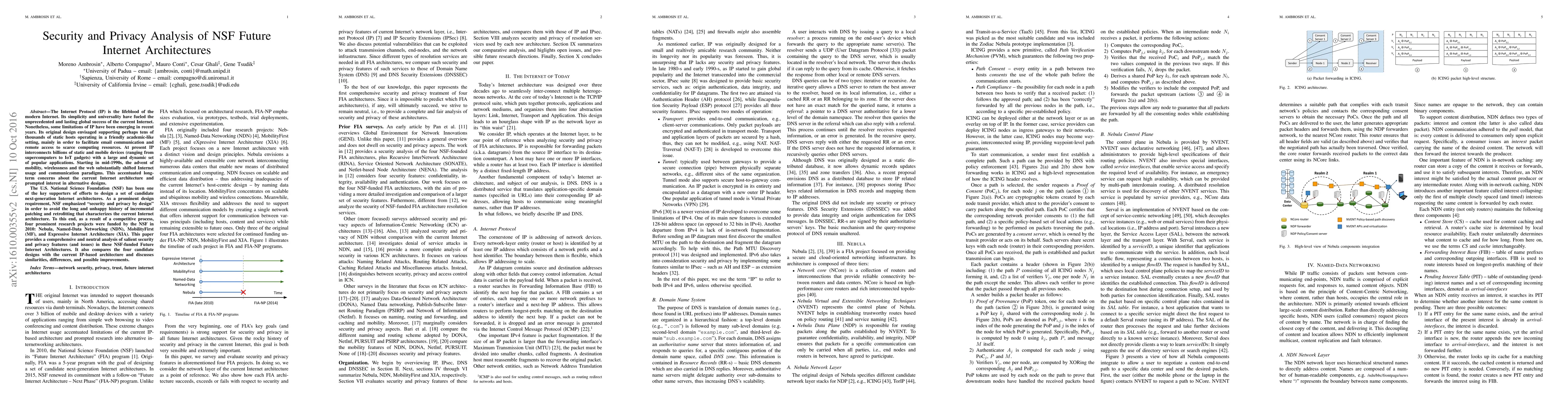 This paper conducts a security and privacy analysis of four NSF-funded next-generation Internet architectures: Nebula, NDN, MF, and XIA. It compares these designs against the current IP-based architecture, highlighting their salient security and privacy features and identifying potential areas for improvement.
