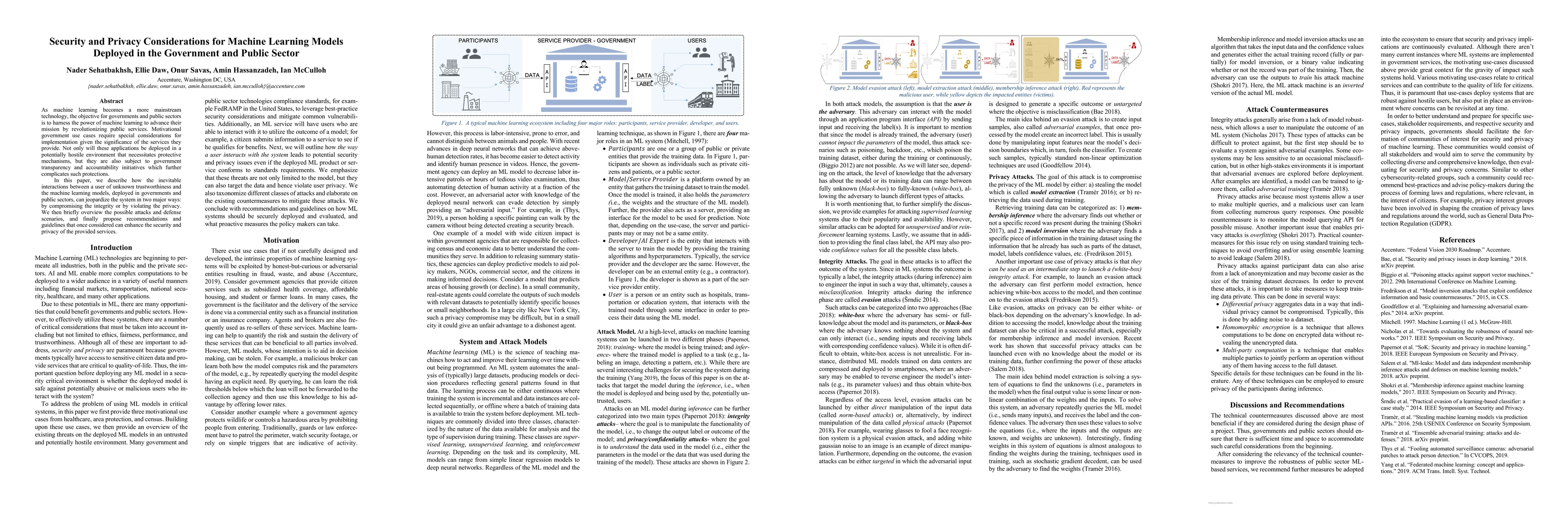 This paper discusses the security and privacy challenges for machine learning models in government and public sectors, emphasizing the risks of integrity compromise and privacy violations from unknown users. It proposes recommendations to enhance security and privacy, considering the unique complexities of government transparency and accountability.