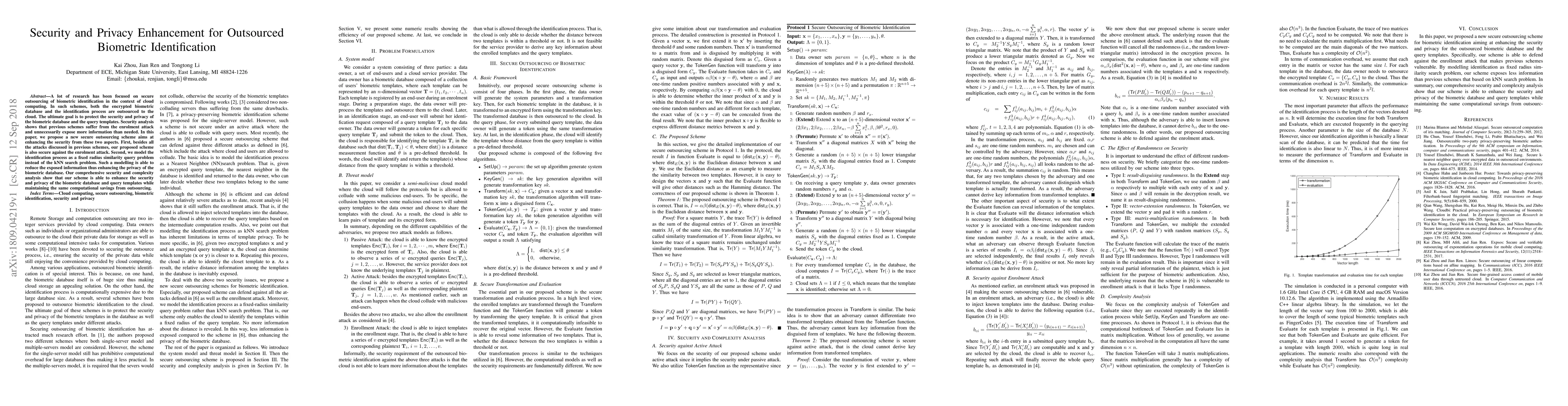 This paper proposes a new secure outsourcing scheme for biometric identification in cloud computing to enhance security and privacy. It addresses enrolment attacks and reduces exposed information by modeling the identification process as a fixed radius similarity query, achieving improved security and privacy while maintaining computational efficiency.