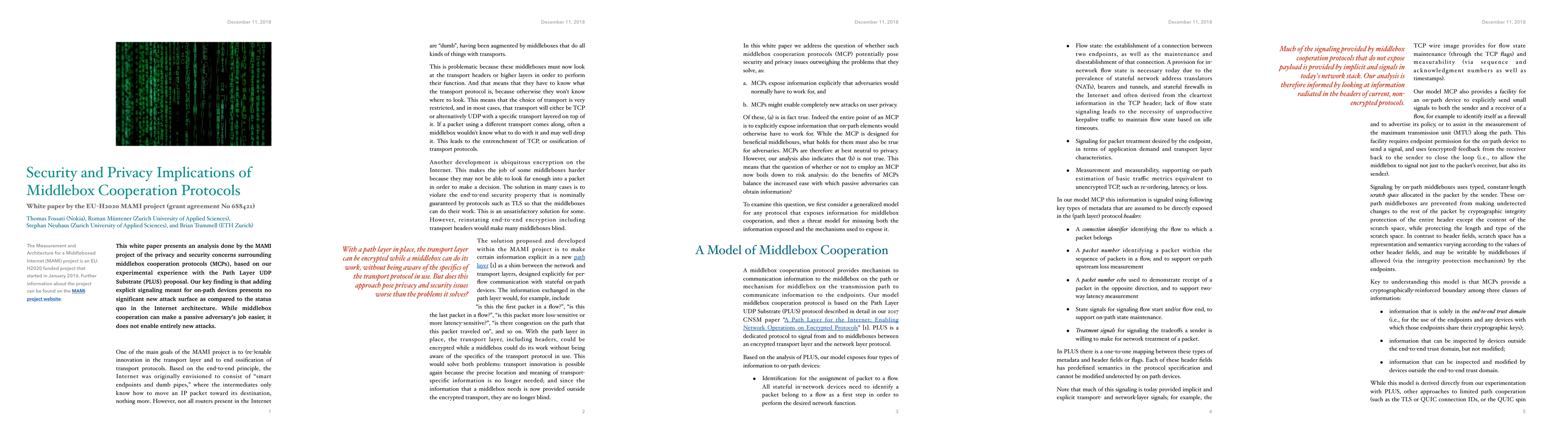 This white paper presents an analysis done by the MAMI project of the privacy and security concerns surrounding middlebox cooperation protocols (MCPs), based on our experimental experience with the Path Layer UDP Substrate (PLUS) proposal. Our key finding is that adding explicit signaling meant for on-path devices presents no significant new attack surface as compared to the status quo in the Internet architecture. While middlebox cooperation can make a passive adversary's job easier, it does not enable entirely new attacks.