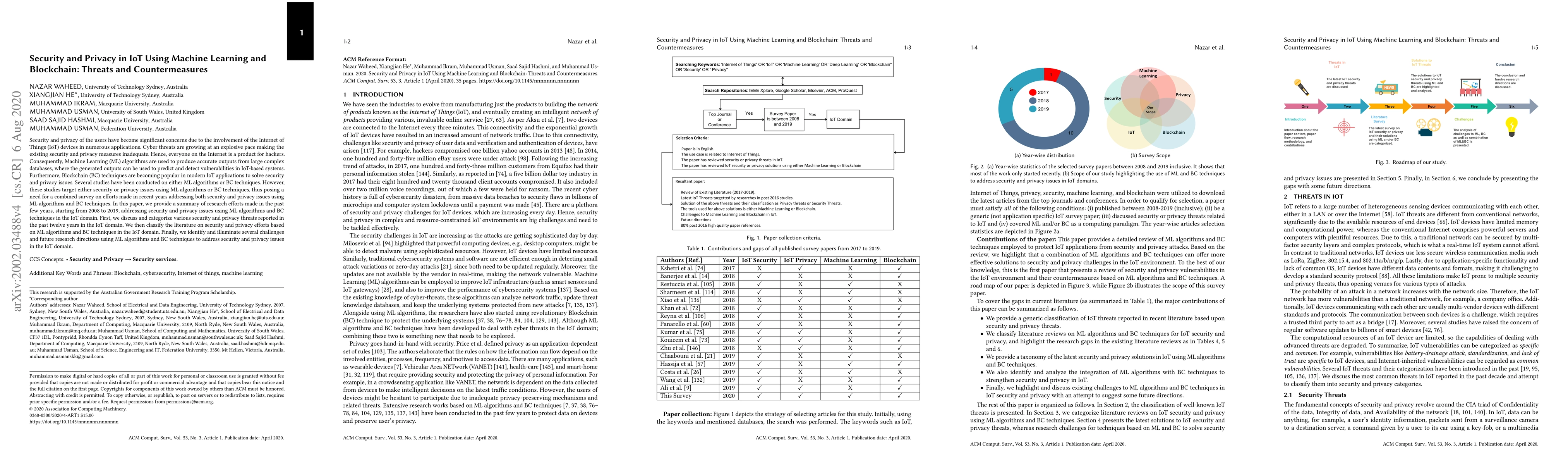 This paper reviews research from 2008 to 2019 on using Machine Learning and Blockchain to tackle security and privacy threats in IoT. It categorizes identified threats and surveys literature on ML and Blockchain-based countermeasures, highlighting challenges and future research directions.