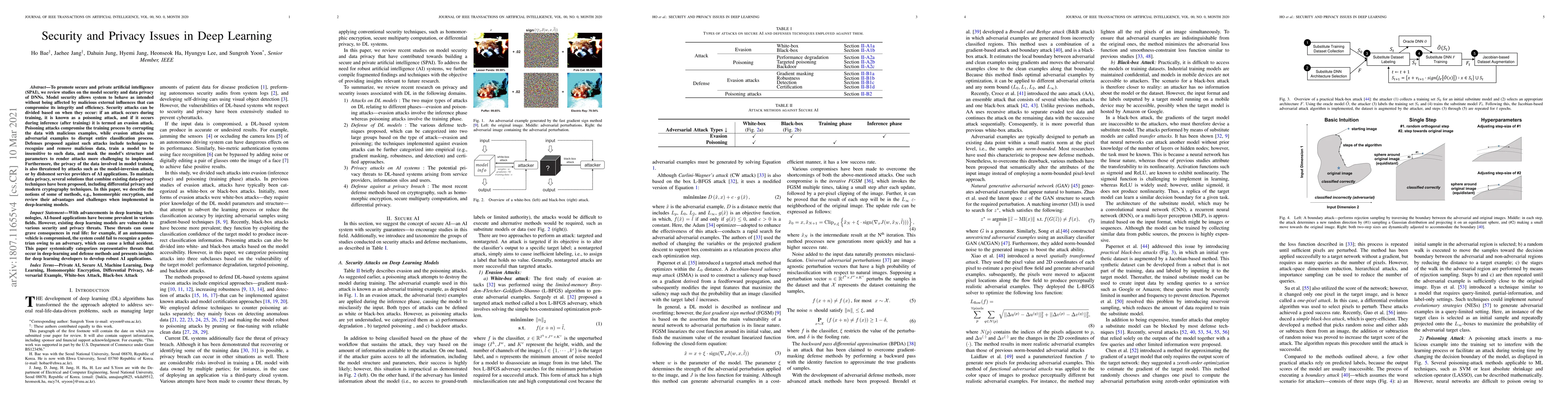 This paper reviews security and privacy issues in deep learning, focusing on defenses against poisoning and evasion attacks, and explores methods like differential privacy and homomorphic encryption to protect data privacy while training deep neural networks. Challenges and advantages of these techniques are also discussed.