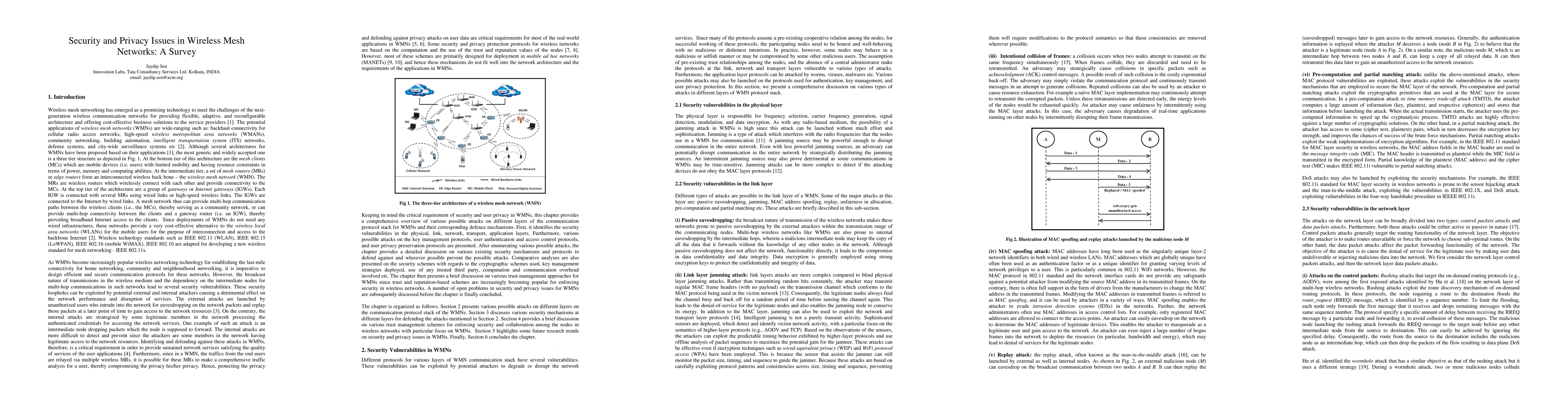 This paper surveys security threats and vulnerabilities in wireless mesh networks (WMNs) across various protocol layers, detailing potential attacks and corresponding defense mechanisms, and discusses trust management and open challenges in WMN security. Comparative analyses and discussions on cryptographic schemes and key management strategies are also included.