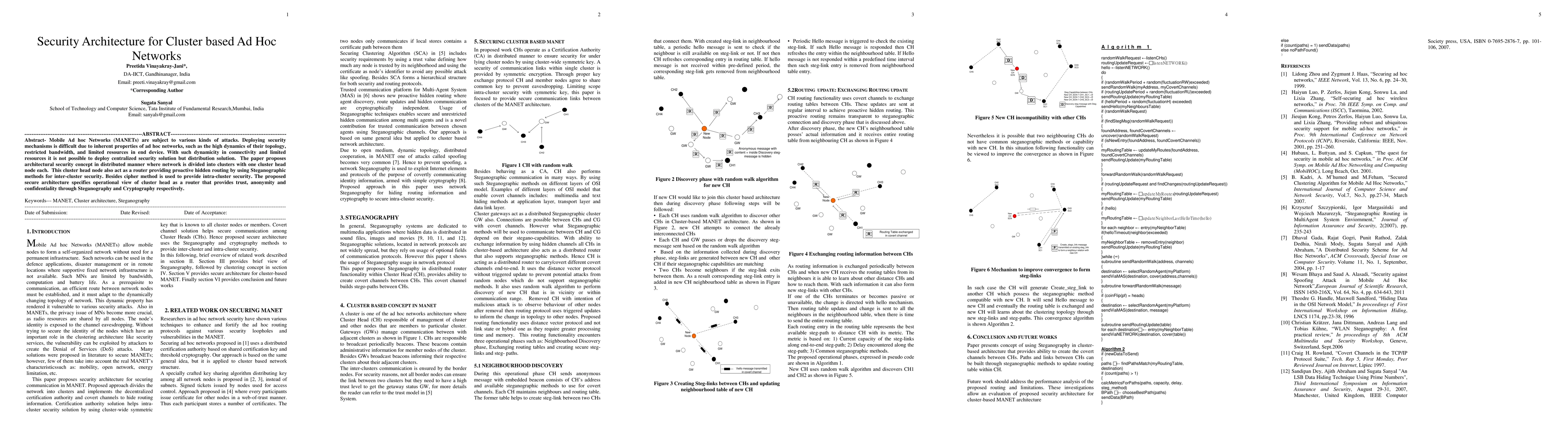 The paper proposes a distributed security architecture for Mobile Ad hoc Networks (MANETs) using cluster-based organization with cluster heads acting as routers, employing Steganography for inter-cluster security and Cryptography for intra-cluster security to ensure trust, anonymity, and confidentiality.