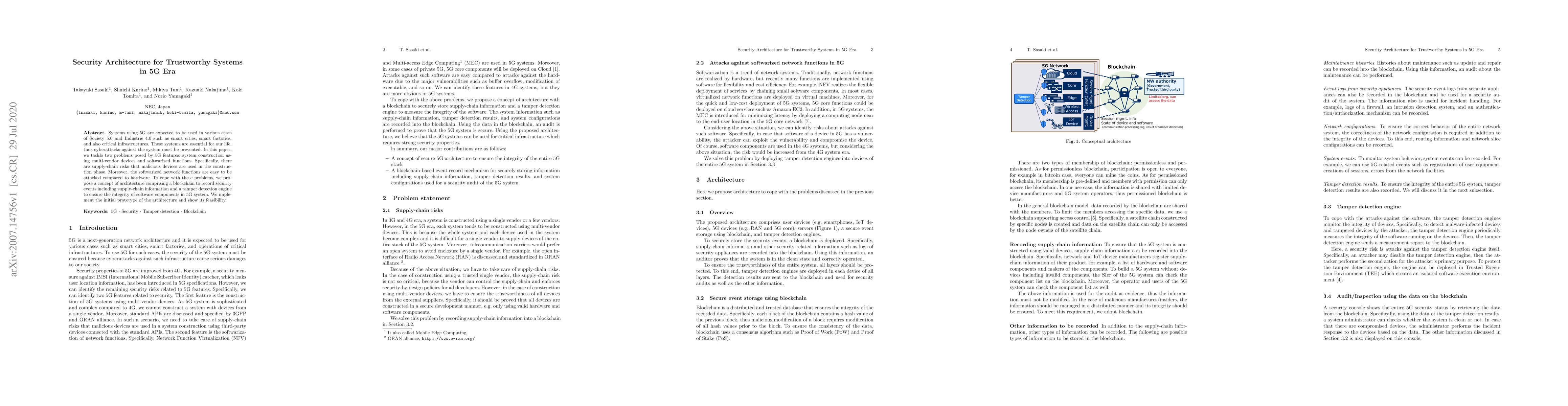 Systems using 5G are expected to be used in various cases of Society 5.0 and Industrie 4.0 such as smart cities, smart factories, and also critical infrastructures. These systems are essential for our life, thus cyberattacks against the system must be prevented. In this paper, we tackle two problems posed by 5G features: system construction using multi-vendor devices and softwarized functions. Specifically, there are supply-chain risks that malicious devices are used in the construction phase. Moreover, the softwarized network functions are easy to be attacked compared to hardware. To cope with these problems, we propose a concept of architecture comprising a blockchain to record security events including supply-chain information and a tamper detection engine to ensure the integrity of software components in 5G system. We implement the initial prototype of the architecture and show its feasibility.