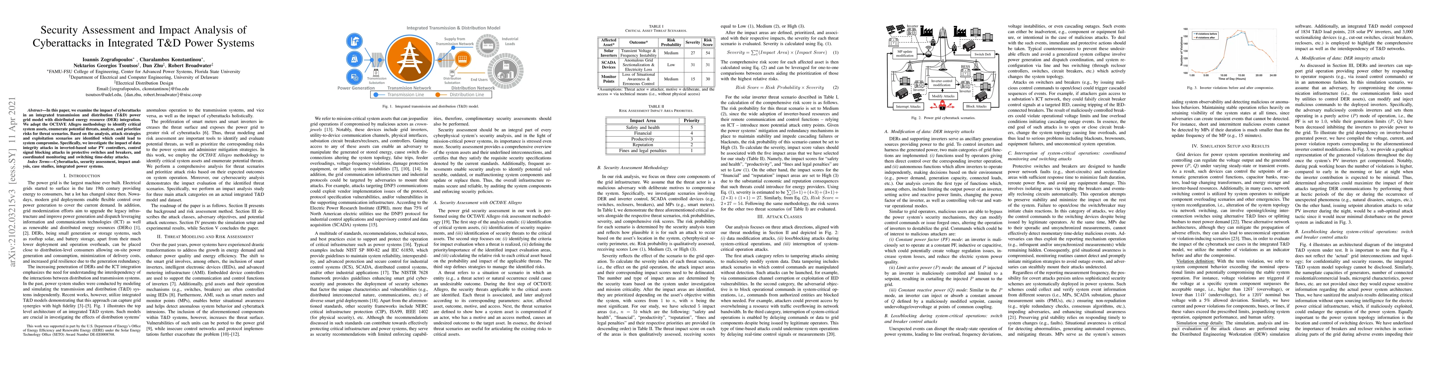 In this paper, we examine the impact of cyberattacks in an integrated transmission and distribution (T&D) power grid model with distributed energy resource (DER) integration. We adopt the OCTAVE Allegro methodology to identify critical system assets, enumerate potential threats, analyze, and prioritize risks for threat scenarios. Based on the analysis, attack strategies and exploitation scenarios are identified which could lead to system compromise. Specifically, we investigate the impact of data integrity attacks in inverted-based solar PV controllers, control signal blocking attacks in protective switches and breakers, and coordinated monitoring and switching time-delay attacks.