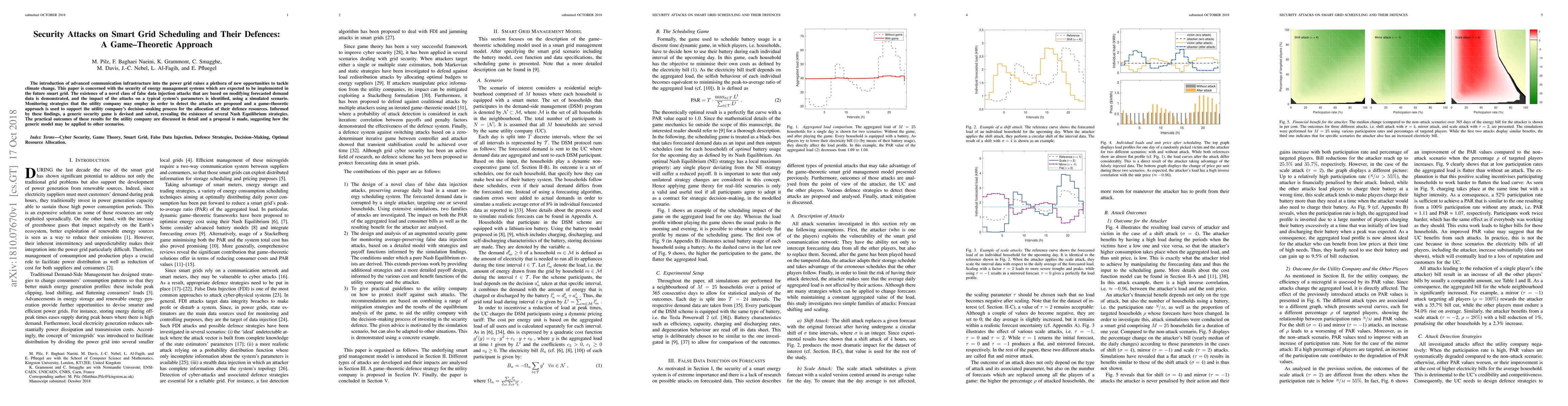 This paper identifies novel false data injection attacks on smart grid scheduling and proposes game-theoretic defence strategies. It demonstrates attack impacts and suggests monitoring strategies, revealing Nash Equilibrium strategies for optimal resource allocation.