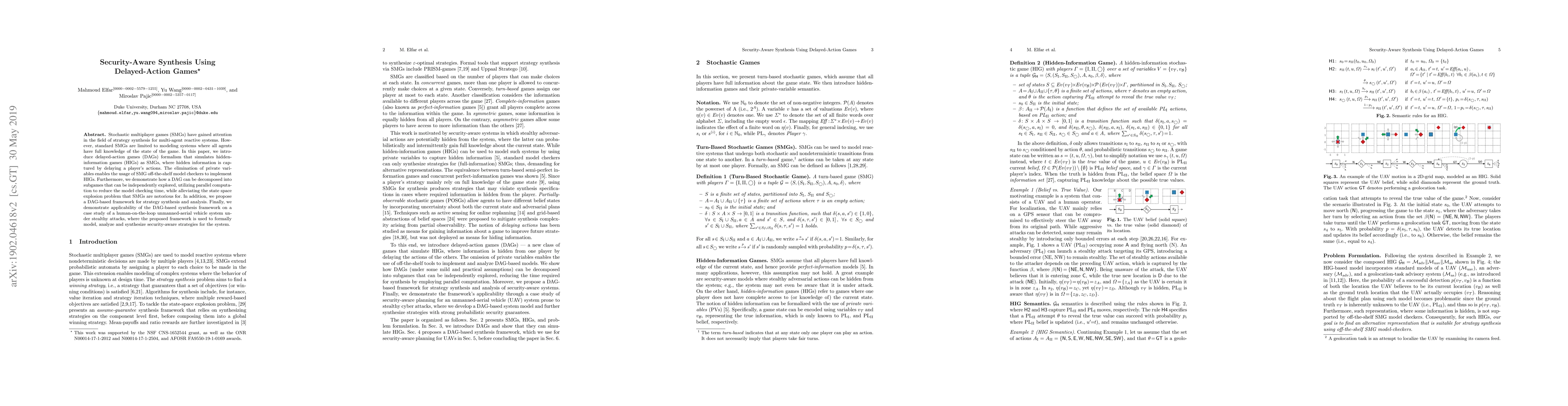 This paper introduces delayed-action games (DAGs) to model hidden-information games (HIGs) using stochastic multiplayer games, allowing for the application of existing SMG model checkers. It also proposes a framework for strategy synthesis and analysis, demonstrating its effectiveness in a case study of a security-aware unmanned-aerial vehicle system under stealthy attacks.
