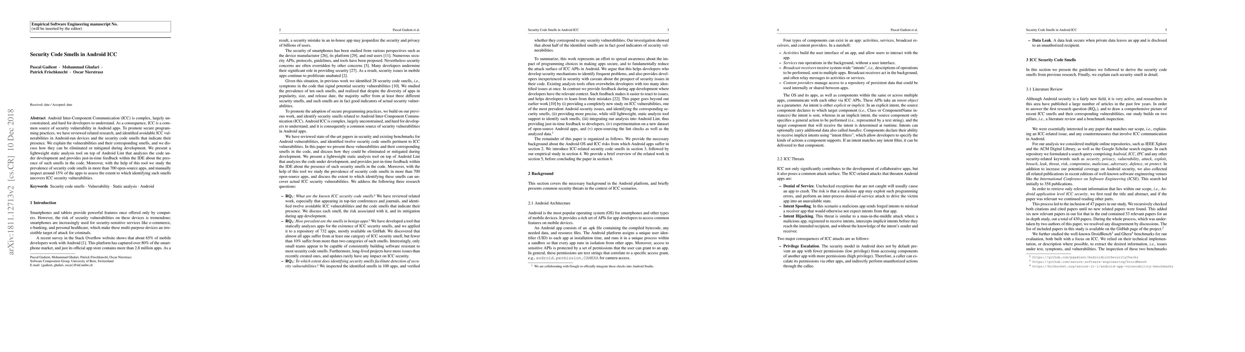This paper identifies security code smells in Android Inter-Component Communication (ICC) that lead to vulnerabilities, presenting a static analysis tool to detect these smells and offering mitigation strategies. The study analyzes over 700 open-source apps, revealing the prevalence of ICC security issues.
