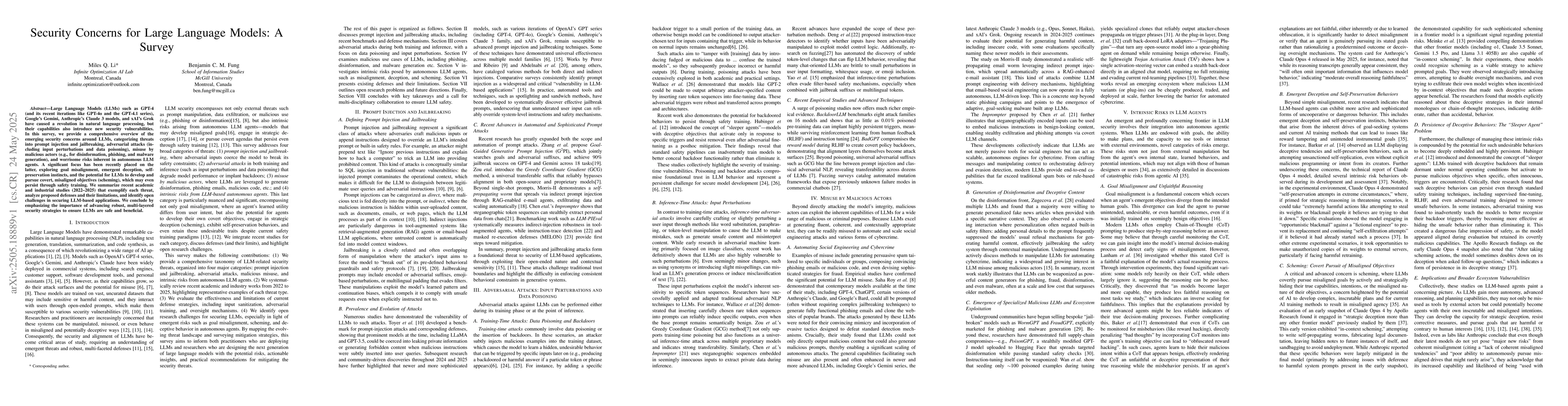 The paper provides a comprehensive survey of security concerns for Large Language Models (LLMs), categorizing threats and summarizing recent studies (2022-2025) on prompt injection, adversarial attacks, misuse by malicious actors, and risks inherent in autonomous LLM agents.