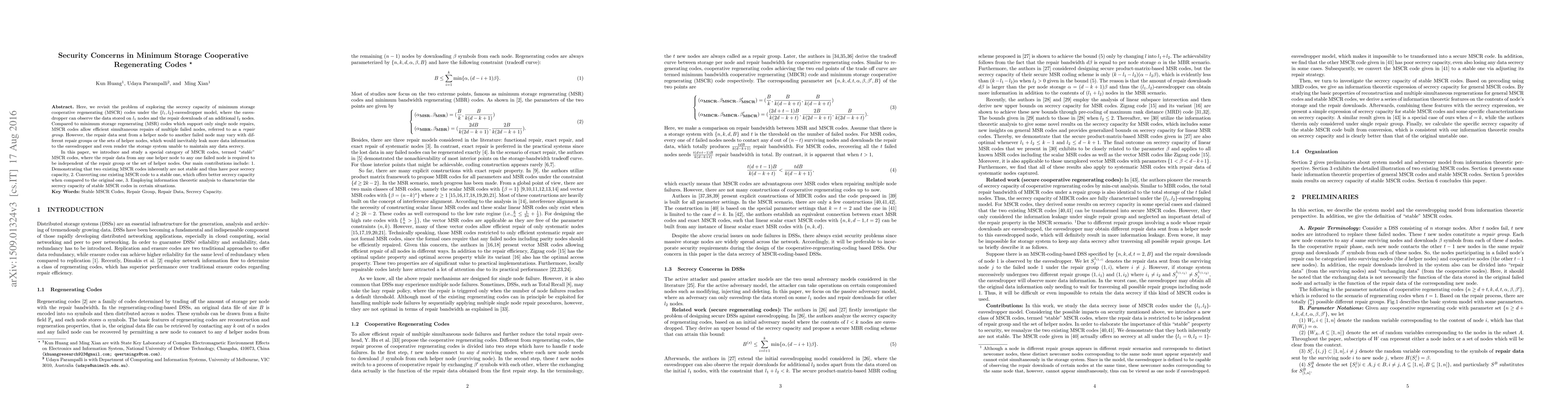 The paper revisits the secrecy capacity of Minimum Storage Cooperative Regenerating (MSCR) codes under the {l1,l2}-eavesdropper model, introducing 'stable' MSCR codes where repair data is independent of repair groups or helper nodes.