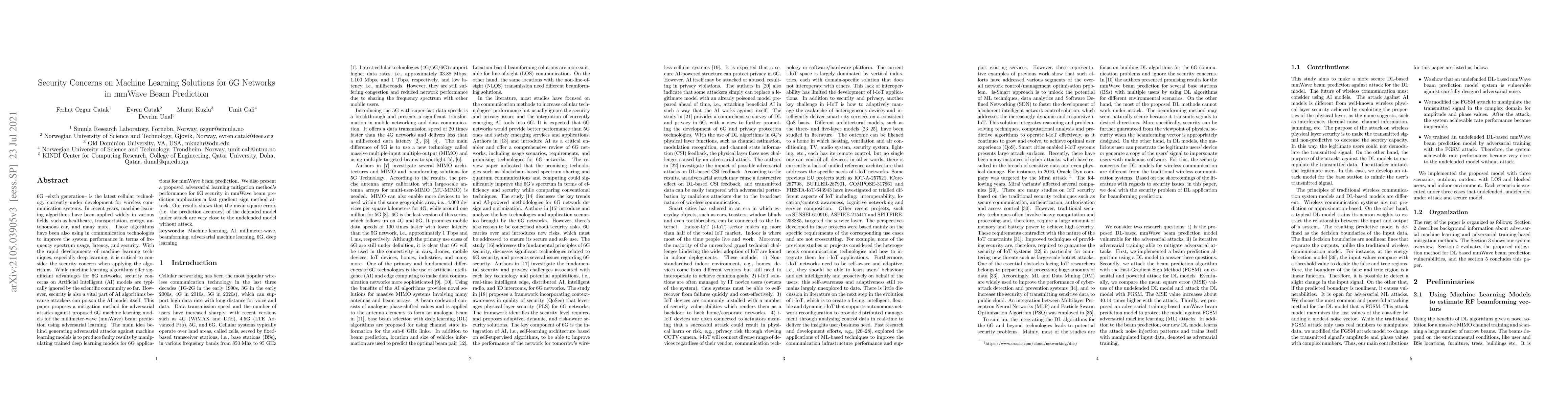 This paper discusses the security concerns of machine learning solutions in 6G networks, focusing on millimeter-wave (mmWave) beam prediction. It proposes a mitigation method using adversarial learning to defend against adversarial attacks, demonstrating that the defended model's performance is nearly as good as the undefended model, indicating effective security for 6G applications.