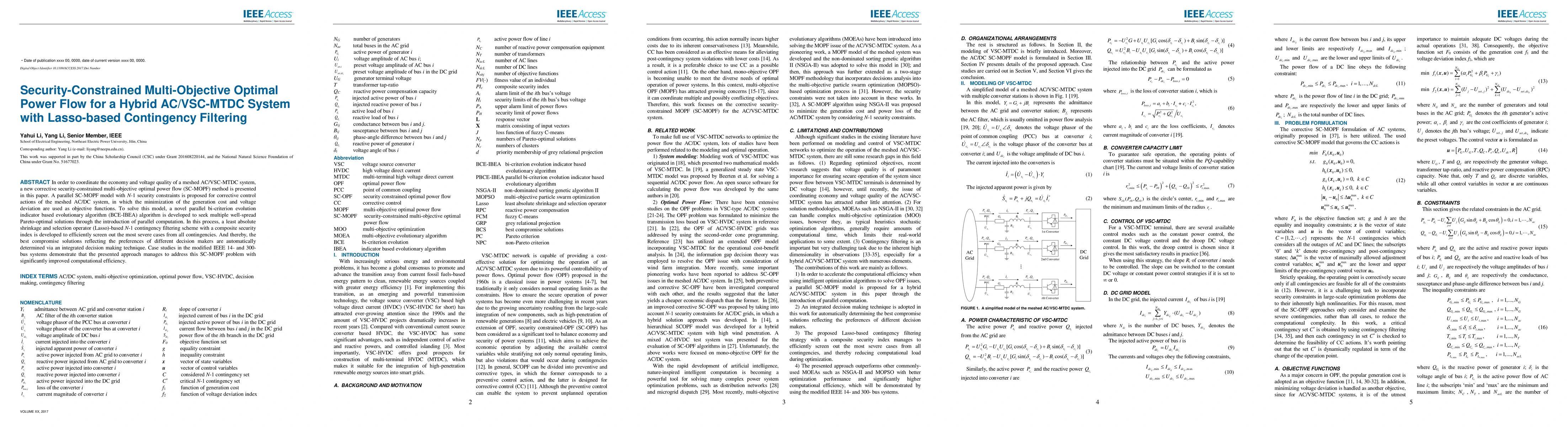 This paper introduces a security-constrained multi-objective optimal power flow method for a hybrid AC/VSC-MTDC system, aiming to balance generation cost and voltage quality. It employs a parallel BCE-IBEA algorithm and a Lasso-based N-1 contingency filtering scheme to efficiently identify severe contingencies and determine Pareto-optimal solutions.