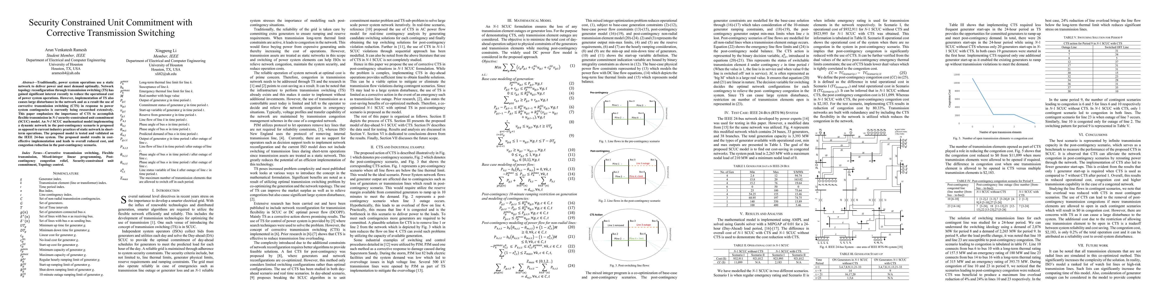 This paper proposes an N-1 security-constrained unit commitment model incorporating corrective transmission switching (CTS) to dynamically reconfigure the network post-contingency, leading to reduced operational costs and congestion. The model is validated on the IEEE 24-bus system, demonstrating cost-effective and flexible transmission.