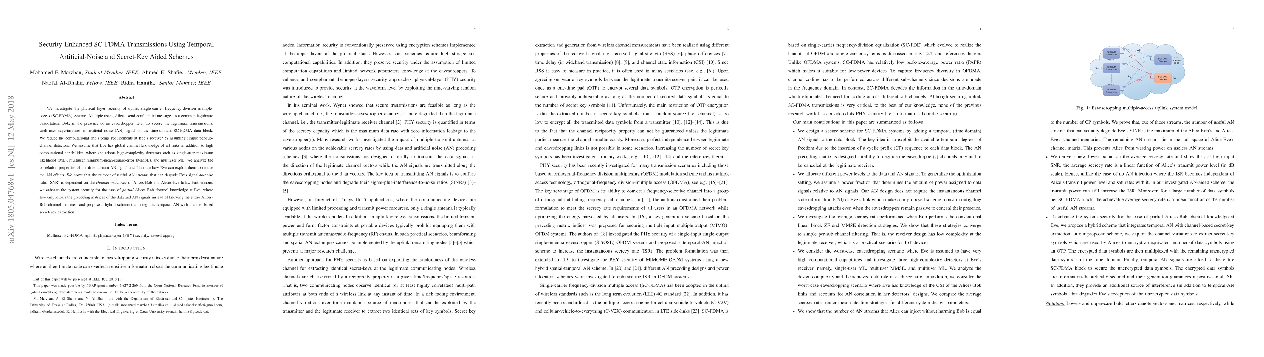 We investigate the physical layer security of uplink single-carrier frequency-division multiple-access (SC-FDMA) systems. Multiple users, Alices, send confidential messages to a common legitimate base-station, Bob, in the presence of an eavesdropper, Eve. To secure the legitimate transmissions, each user superimposes an artificial noise (AN) signal on the time-domain SC-FDMA data block. We reduce the computational and storage requirements at Bob's receiver by assuming simple per-subchannel detectors. We assume that Eve has global channel knowledge of all links in addition to high computational capabilities, where she adopts high-complexity detectors such as single-user maximum likelihood (ML), multiuser minimum-mean-square-error (MMSE), and multiuser ML. We analyze the correlation properties of the time-domain AN signal and illustrate how Eve can exploit them to reduce the AN effects. We prove that the number of useful AN streams that can degrade Eve's signal-to-noise ratio (SNR) is dependent on the channel memories of Alices-Bob and Alices-Eve links. Furthermore, we enhance the system security for the case of partial Alices-Bob channel knowledge at Eve, where Eve only knows the precoding matrices of the data and AN signals instead of knowing the entire Alices-Bob channel matrices, and propose a hybrid scheme that integrates temporal AN with channel-based secret-key extraction.