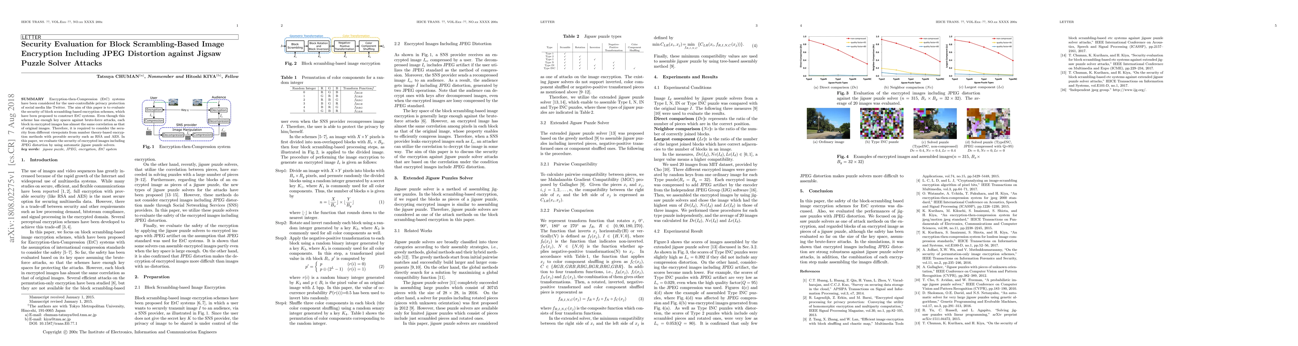 The paper evaluates the security of block scrambling-based image encryption schemes for Encryption-then-Compression (EtC) systems using automatic jigsaw puzzle solvers, including JPEG distortion.