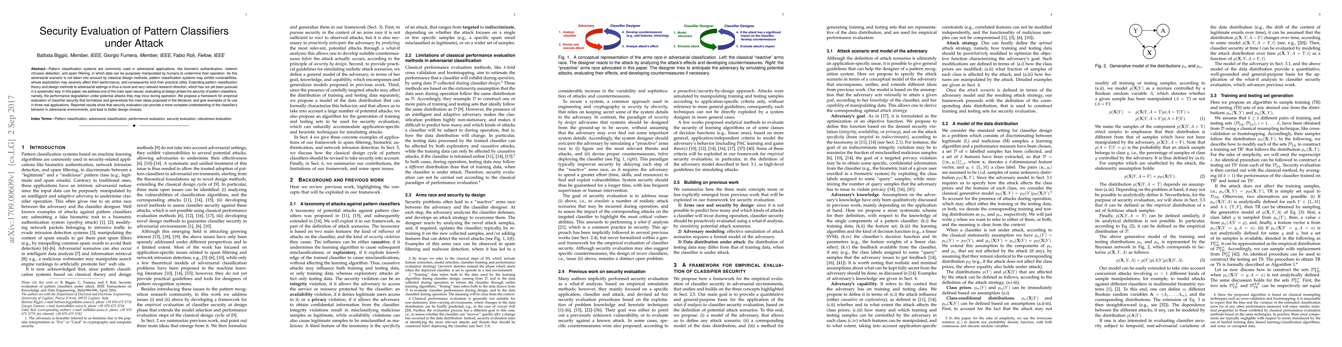 This paper proposes a framework to evaluate the security of pattern classifiers under attack, revealing vulnerabilities that can severely impact performance in real-world applications. The results provide a more complete understanding of classifier behavior in adversarial environments.