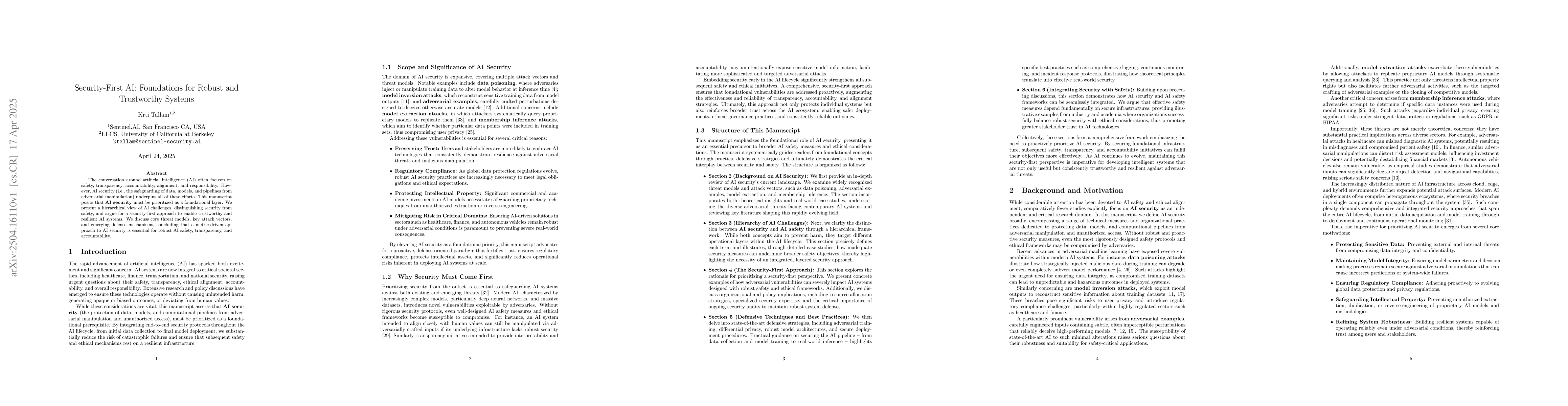 The paper presents a hierarchical view of AI challenges, distinguishing security from safety, and advocates for a security-first approach to build trustworthy and resilient AI systems.