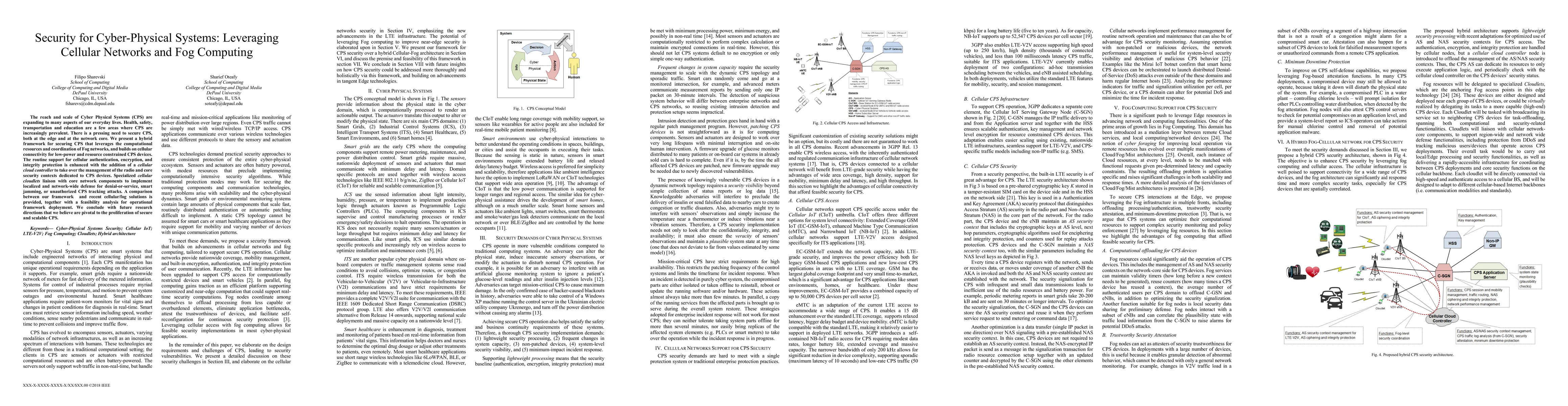 The reach and scale of Cyber Physical Systems (CPS) are expanding to many aspects of our everyday lives. Health, safety, transportation and education are a few areas where CPS are increasingly prevalent. There is a pressing need to secure CPS, both at the edge and at the network core. We present a hybrid framework for securing CPS that leverages the computational resources and coordination of Fog networks, and builds on cellular connectivity for low-power and resource constrained CPS devices. The routine support for cellular authentication, encryption, and integrity protection is enhanced with the addition of a cellular cloud controller to take over the management of the radio and core security contexts dedicated to CPS devices. Specialized cellular cloudlets liaison with core network components to implement localized and network-wide defense for denial-or-service, smart jamming, or unauthorized CPS tracking attacks. A comparison between our framework and recent cellular/fog solutions is provided, together with a feasibility analysis for operational framework deployment. We conclude with future research directions that we believe are pivotal to the proliferation of secure and scalable CPS.