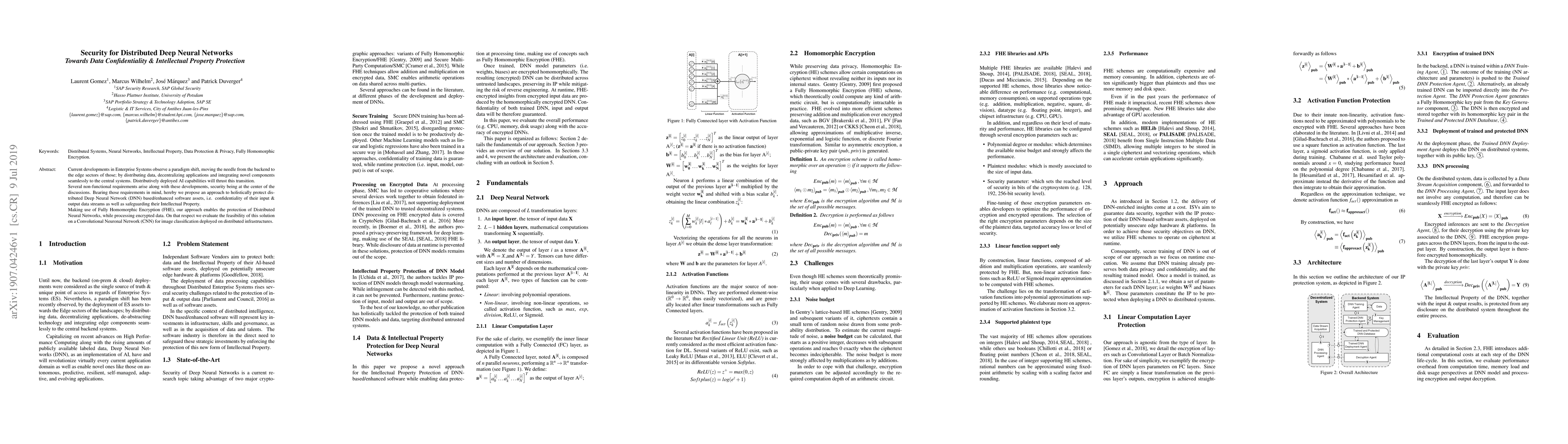 Current developments in Enterprise Systems observe a paradigm shift, moving the needle from the backend to the edge sectors of those; by distributing data, decentralizing applications and integrating novel components seamlessly to the central systems. Distributively deployed AI capabilities will thrust this transition. Several non-functional requirements arise along with these developments, security being at the center of the discussions. Bearing those requirements in mind, hereby we propose an approach to holistically protect distributed Deep Neural Network (DNN) based/enhanced software assets, i.e. confidentiality of their input & output data streams as well as safeguarding their Intellectual Property. Making use of Fully Homomorphic Encryption (FHE), our approach enables the protection of Distributed Neural Networks, while processing encrypted data. On that respect we evaluate the feasibility of this solution on a Convolutional Neuronal Network (CNN) for image classification deployed on distributed infrastructures.