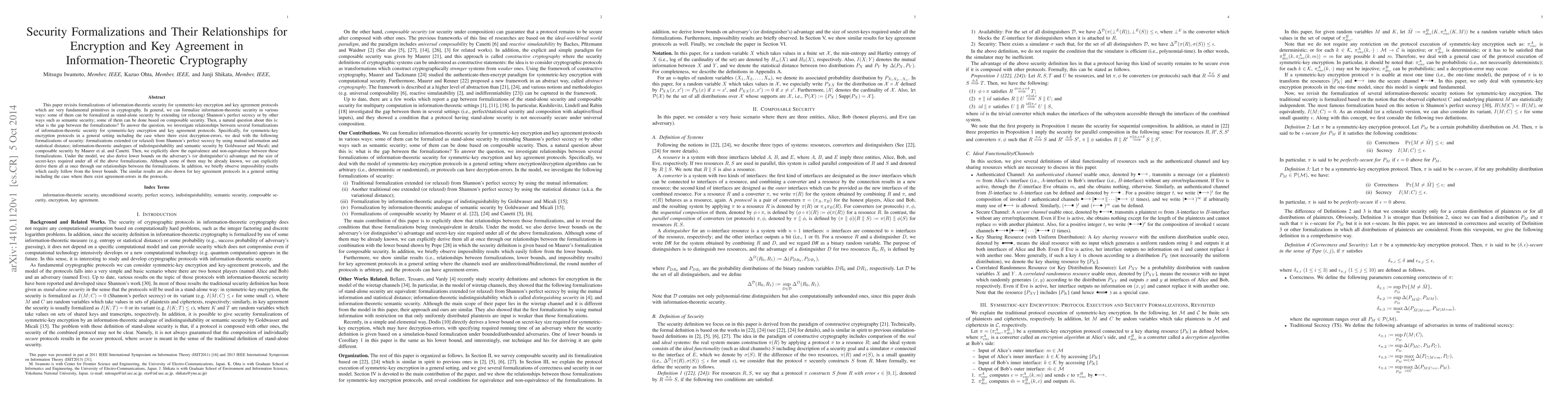 This paper explores various formalizations of information-theoretic security for symmetric-key encryption and key agreement protocols, investigating their relationships and equivalences. It derives lower bounds on the adversary's advantage and key sizes, and observes impossibility results stemming from these bounds.
