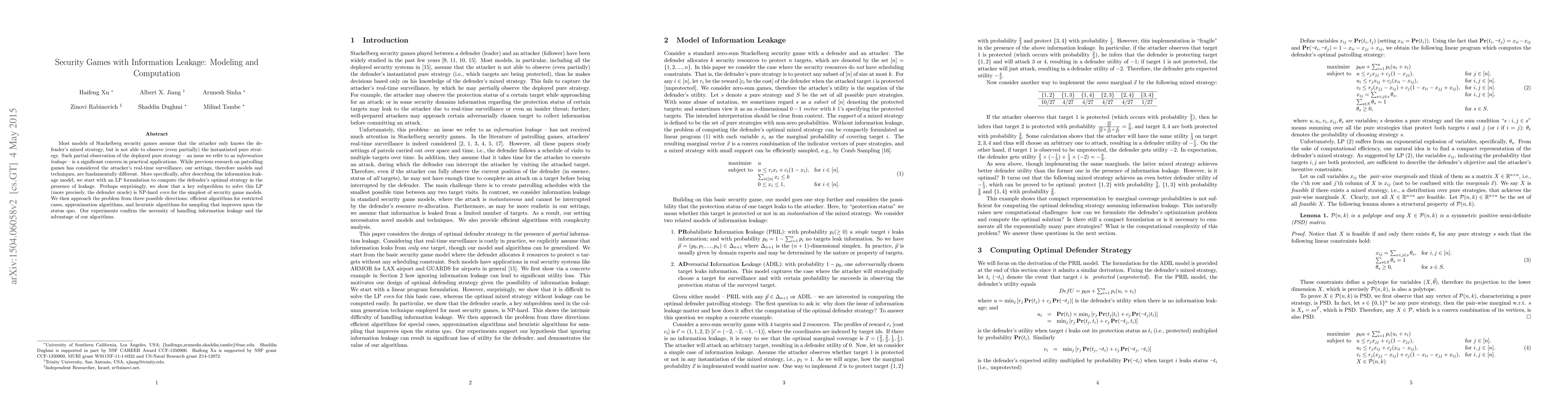 This paper models Stackelberg security games with information leakage, where attackers can partially observe the defender's pure strategy. It presents an LP formulation and proves that solving a key subproblem is NP-hard, and proposes efficient, approximation, and heuristic algorithms for practical computation. Experiments validate the importance of addressing information leakage and the effectiveness of the proposed algorithms.