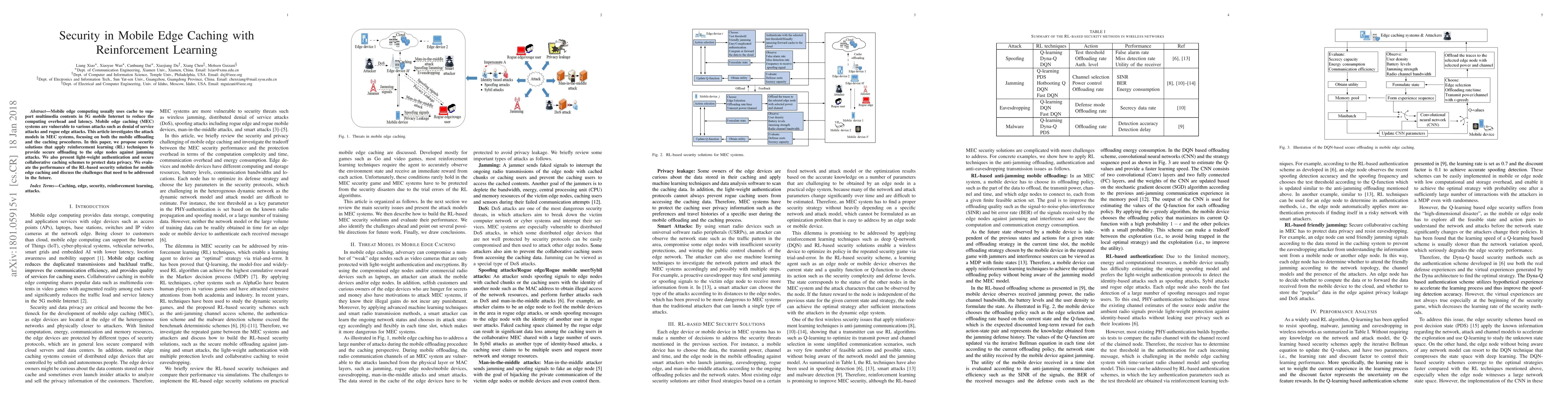 This paper explores security vulnerabilities in mobile edge caching systems, proposing reinforcement learning techniques to counter jamming attacks and introducing lightweight authentication and secure collaborative caching to protect data privacy. The effectiveness of these RL-based security solutions is evaluated, with a discussion on future challenges.