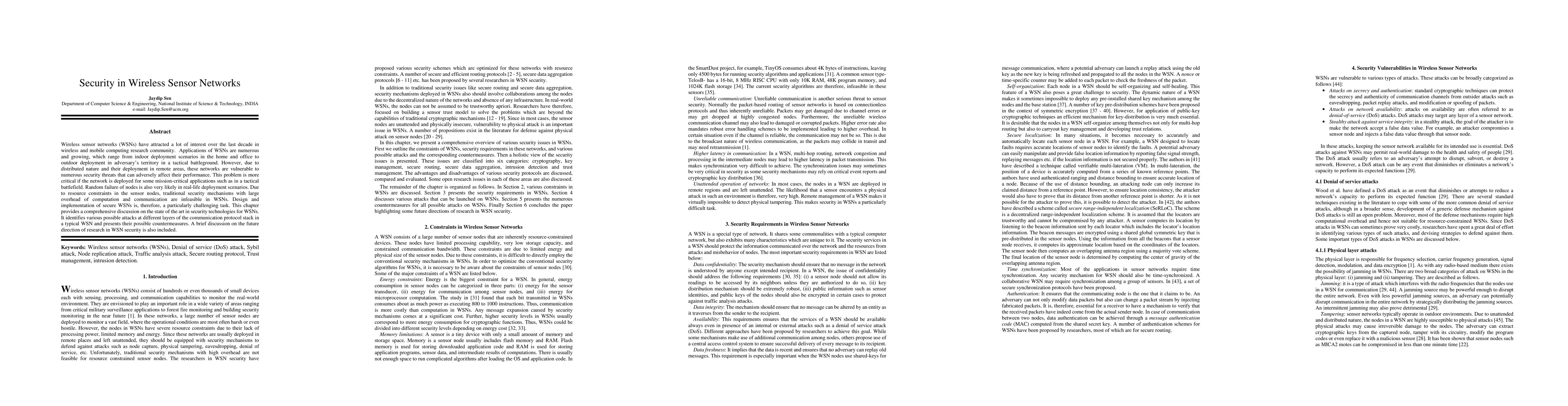 Wireless sensor networks have attracted a lot of interest over the last decade in wireless and mobile computing research community. Applications of these networks are numerous and growing, which range from indoor deployment scenarios in the home and office to outdoor deployment in adversary's territory in a tactical battleground. However, due to distributed nature and their deployment in remote areas, these networks are vulnerable to numerous security threats that can adversely affect their performance. This chapter provides a comprehensive discussion on the state of the art in security technologies for wireless sensor networks. It identifies various possible attacks at different layers of the communication protocol stack in a typical sensor network and their possible countermeasures. A brief discussion on the future direction of research in WSN security is also included.