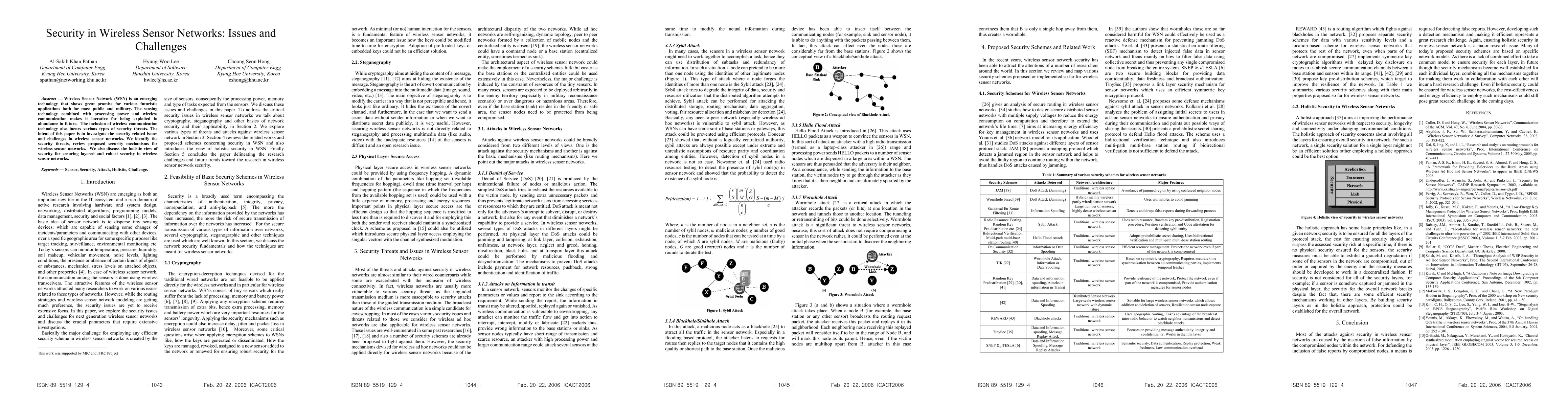 This paper explores the security issues and challenges in Wireless Sensor Networks (WSN), identifying various threats and reviewing proposed security mechanisms. It emphasizes the need for a holistic, layered approach to ensure robust security in WSNs.