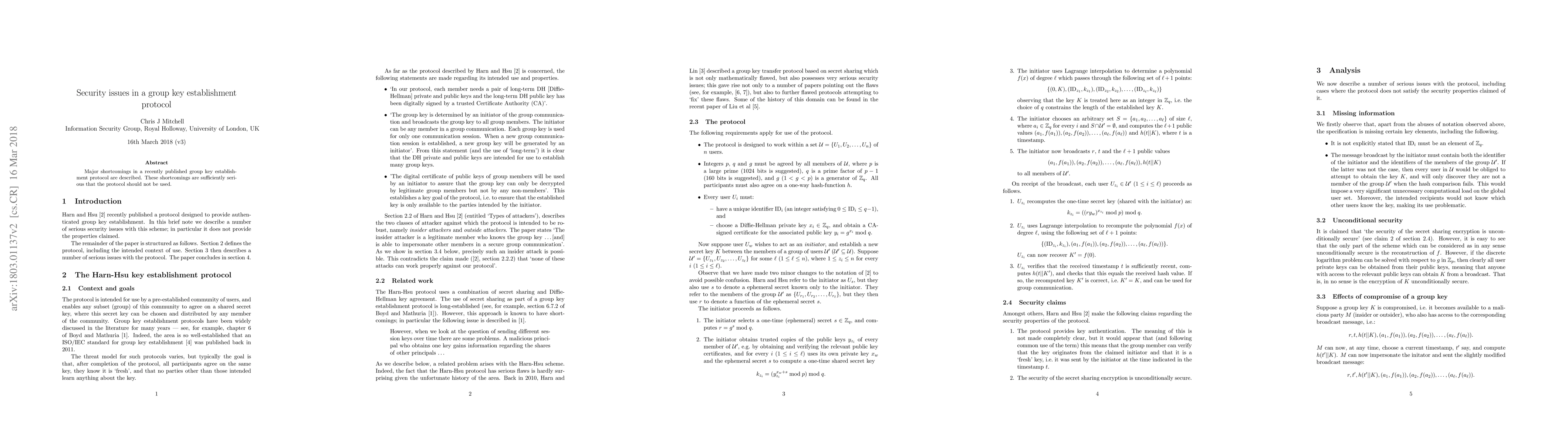 Major shortcomings in a recently published group key establishment protocol are described. These shortcomings are sufficiently serious that the protocol should not be used.