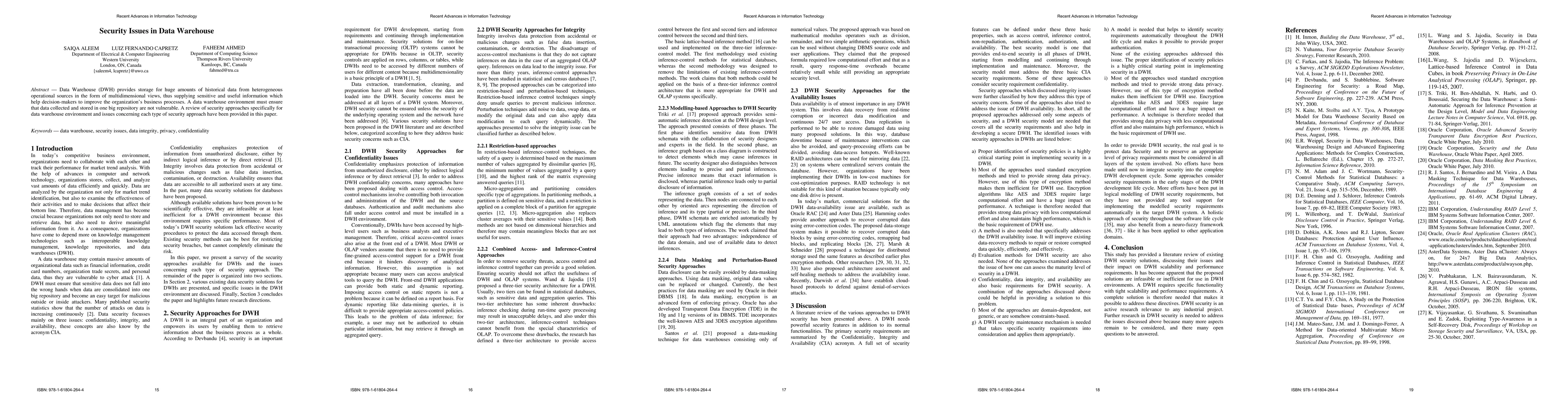 This paper reviews security approaches for data warehouses, emphasizing the need to protect sensitive historical data stored in these repositories, and discusses the issues associated with each type of security method.