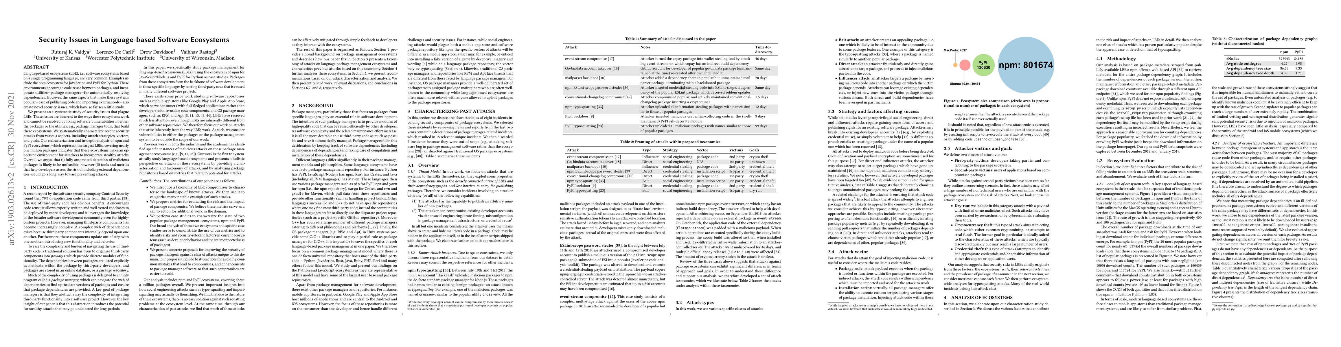 This paper systematically examines security issues in language-based software ecosystems (LBEs), highlighting that the ease of publishing and importing code creates novel security challenges. The study finds that these ecosystems are vulnerable to stealthy attacks, and while detecting malicious packages fully is unfeasible, risk assessment tools for developers can significantly mitigate threats.